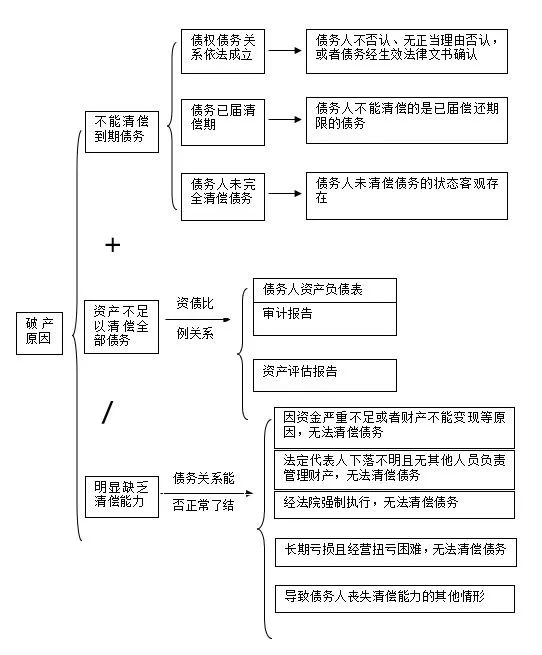 《中华人民共和国企业破产法》(下称“《破产法》”)第2条第1款规定:“企业法人不能清偿到期债务,并且资产不足以清偿全部债务或者明显缺乏清偿能力的,依照本法规定清理债务。”根据该条可知,我国企业法人破产的原因有两个:“不能清偿到期债务,并且资产不足以清偿全部债务”或者“不能清偿到期债务,并且明显缺乏清偿能力”。以上两个破产原因均有两个要素合并构成,且两种原因中均包含“不能清偿到期债务”这一要素。