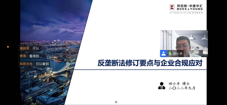 2022年9月21日,上海邦信阳中建中汇律师事务所合伙人田小丰律师受上海市国有资产监督管理委员会邀请,为上海国有企业作了题为“反垄断法修订要点与企业合规应对”的主题演讲。