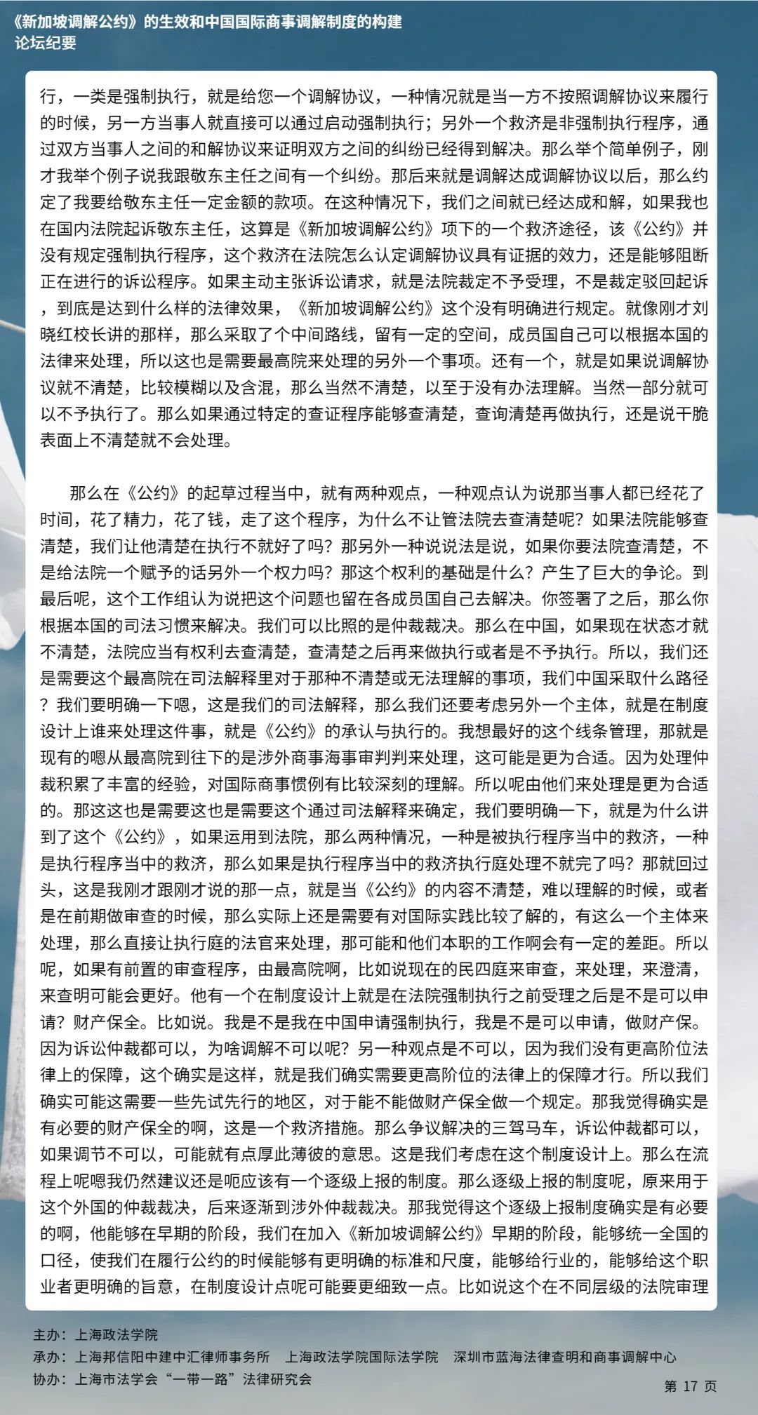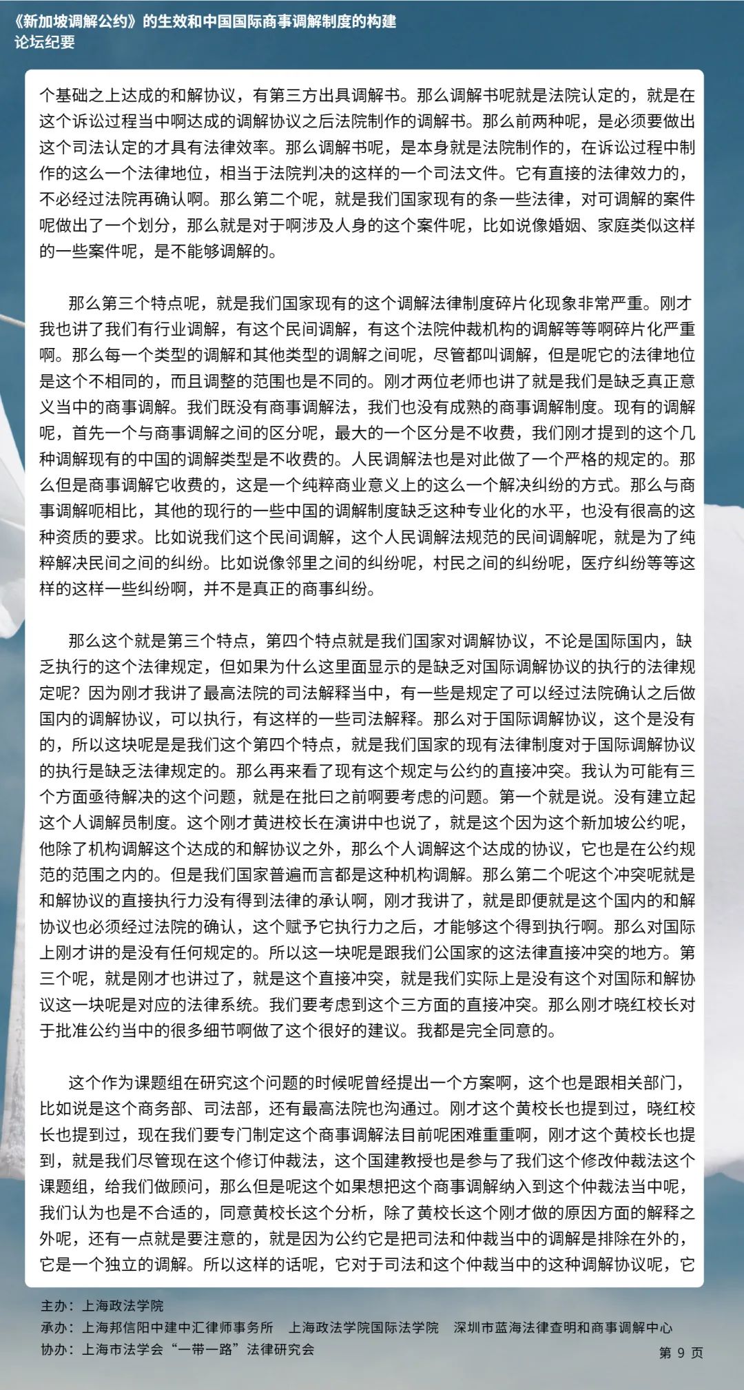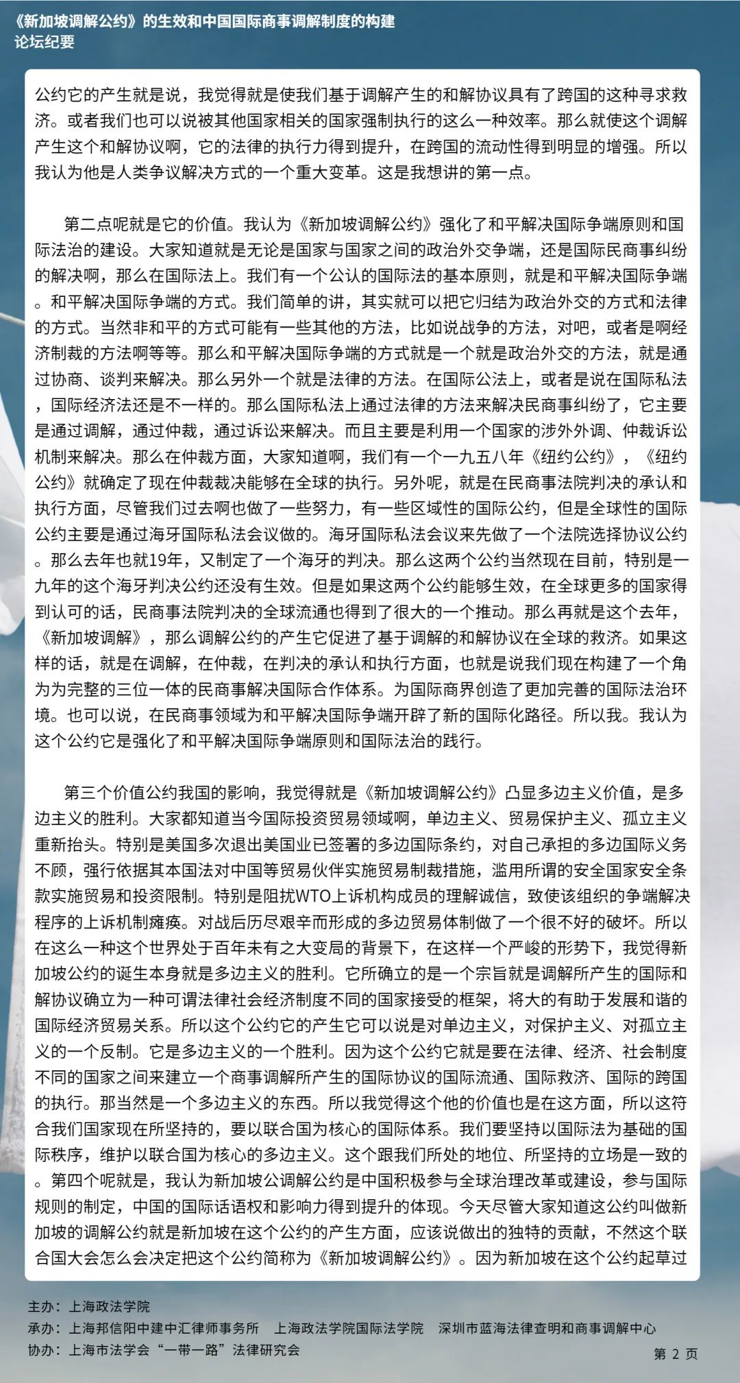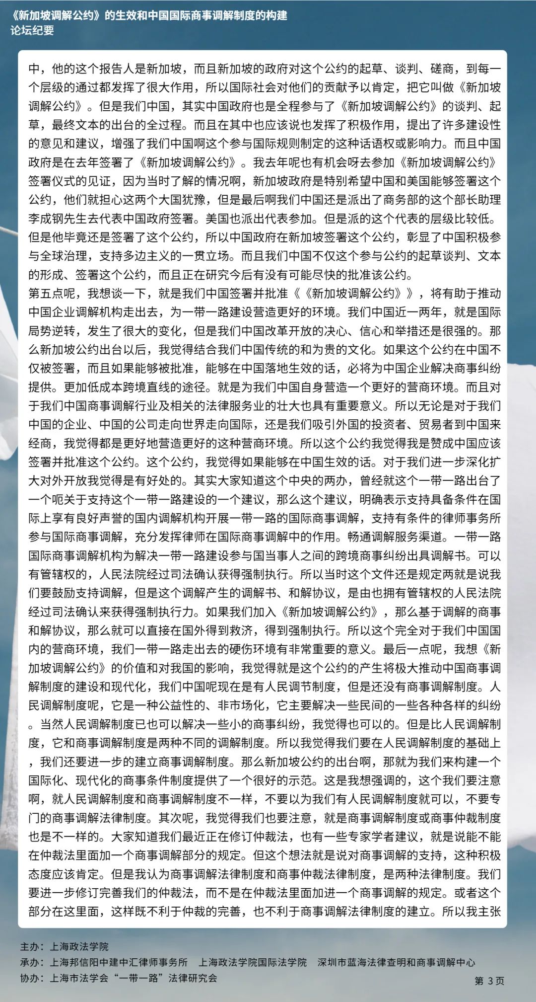 本次论坛集中国内知名专家学者的智慧,就《新加坡调解公约》的生效和中国国际商事调解制度的构建等问题分享真知灼见,有利于加强我国知名专家学者的互动交流,推动《新加坡调解公约》在我国的批准与落实,对于完善我国国际商事调解制度的现代化建设、促进中国特色社会主义的完善与发展具有具有十分重要的意义。