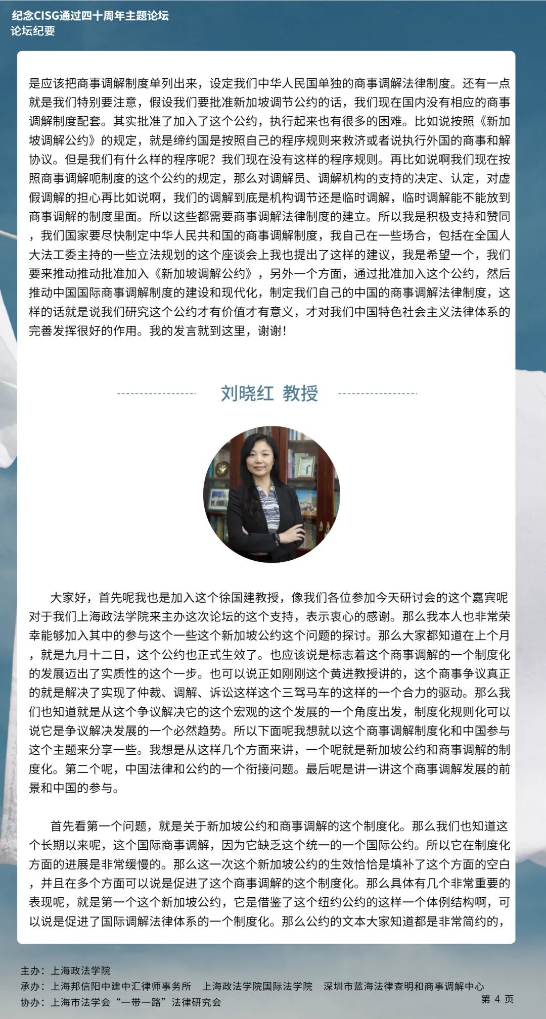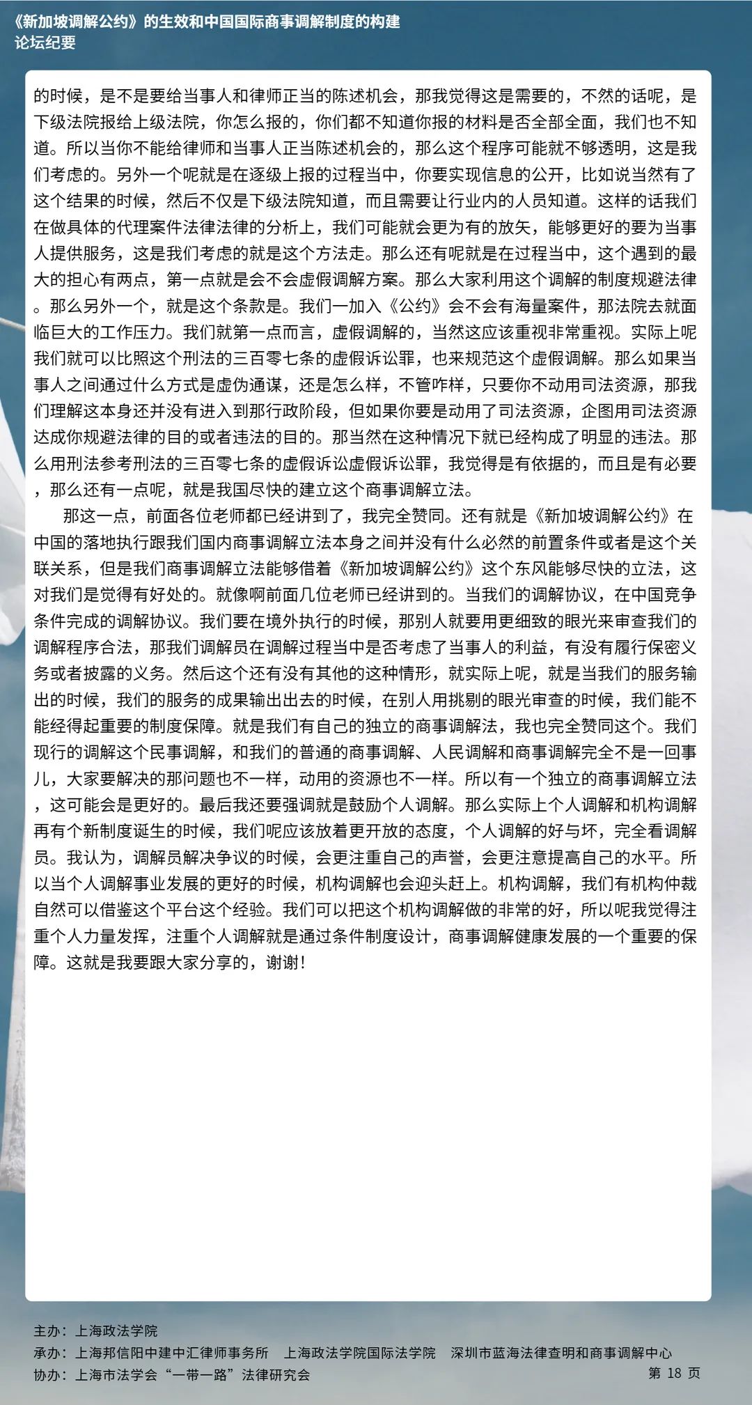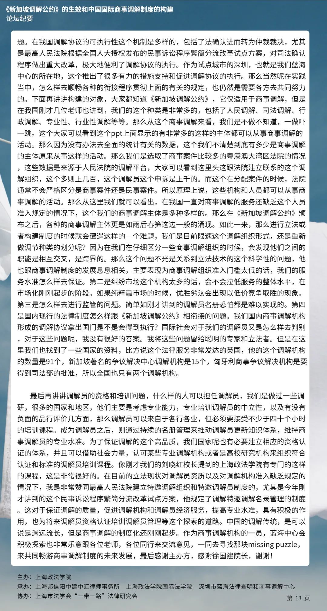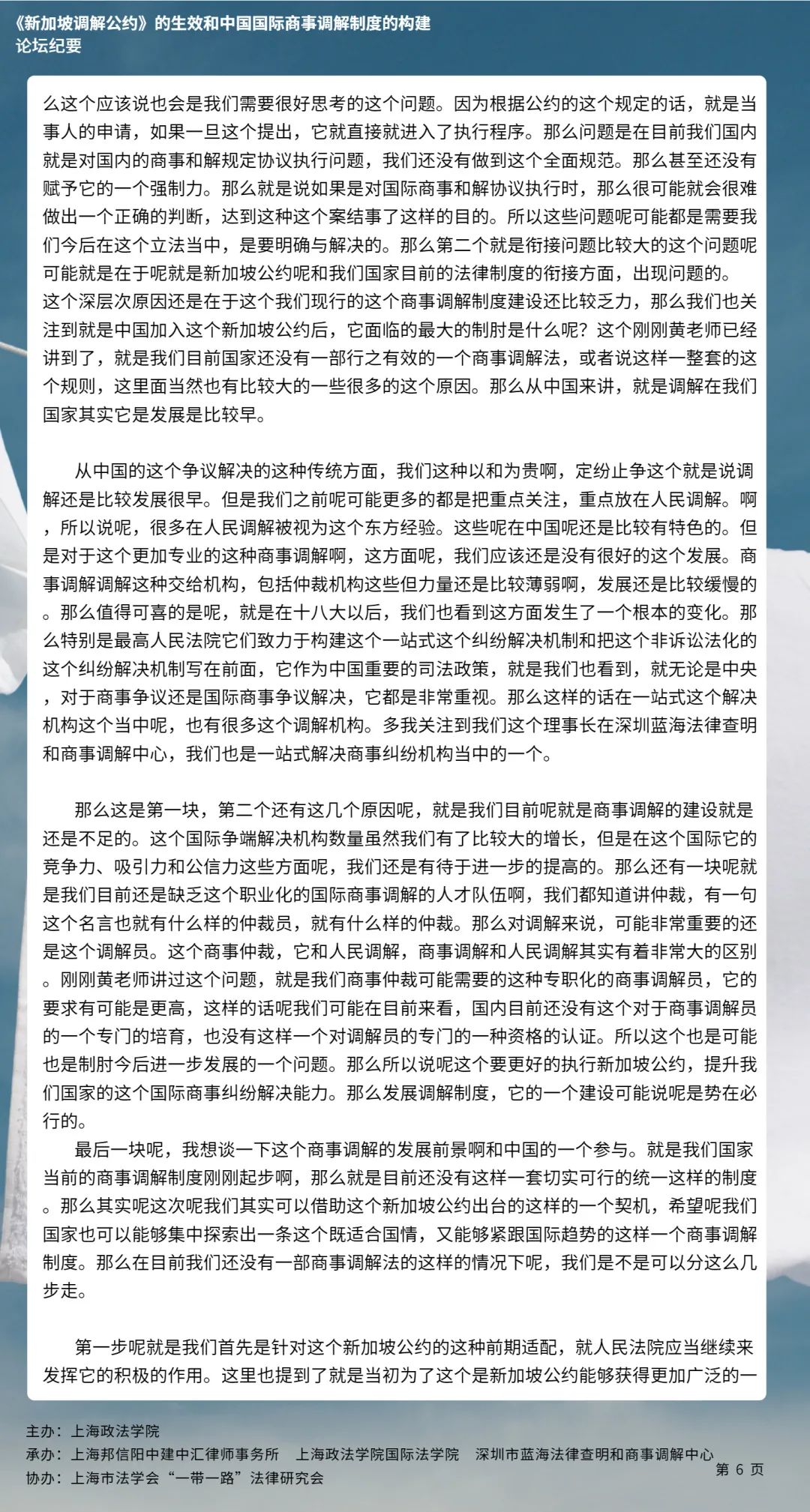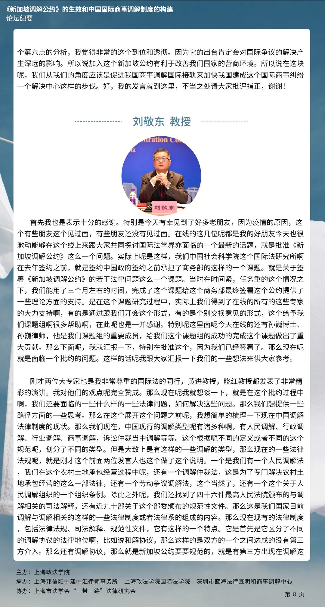 本次论坛集中国内知名专家学者的智慧,就《新加坡调解公约》的生效和中国国际商事调解制度的构建等问题分享真知灼见,有利于加强我国知名专家学者的互动交流,推动《新加坡调解公约》在我国的批准与落实,对于完善我国国际商事调解制度的现代化建设、促进中国特色社会主义的完善与发展具有具有十分重要的意义。