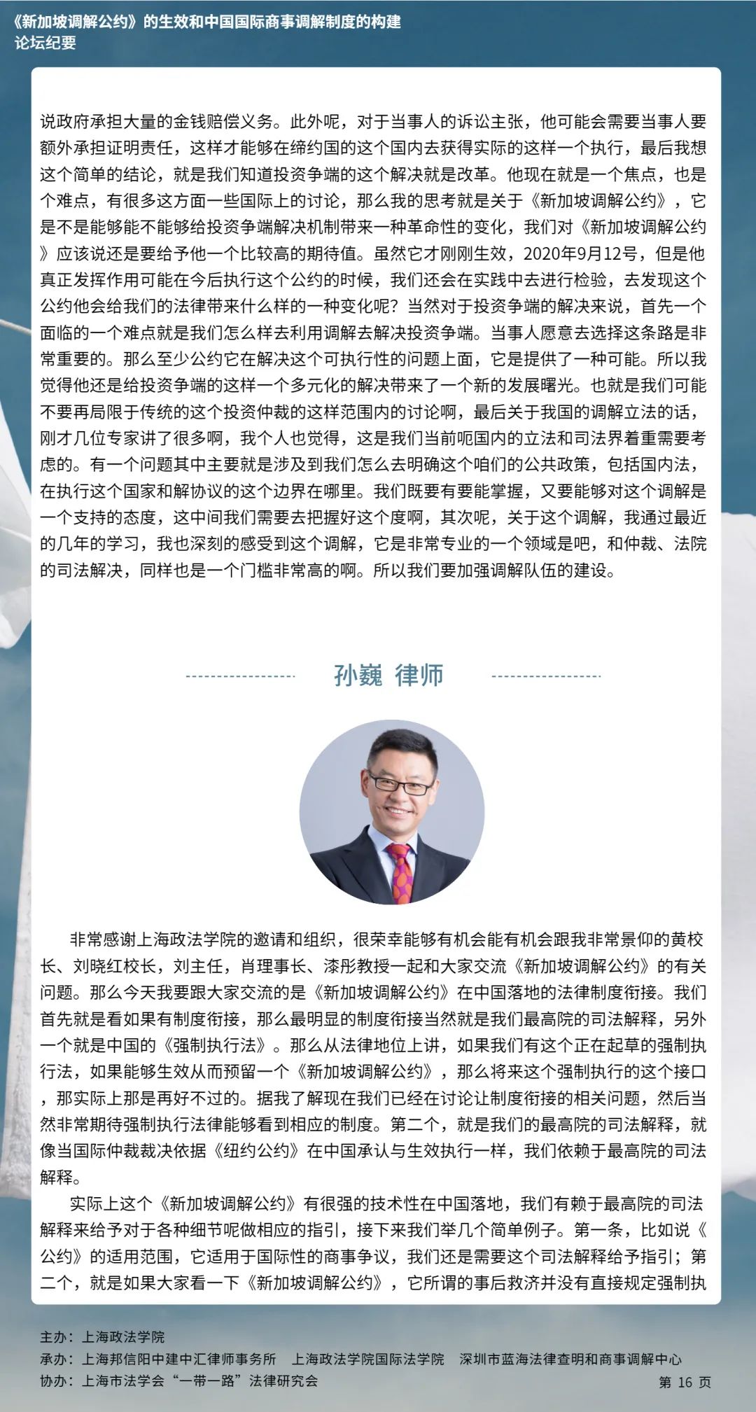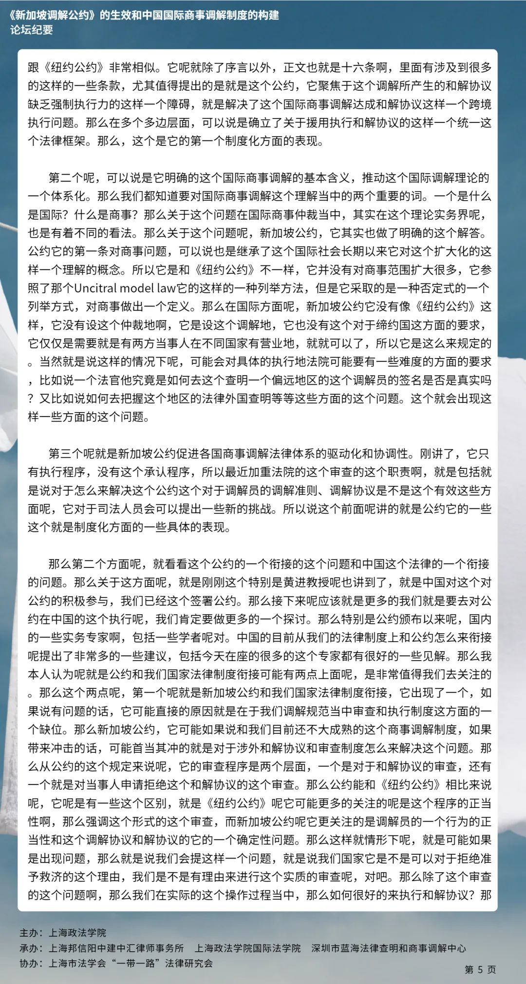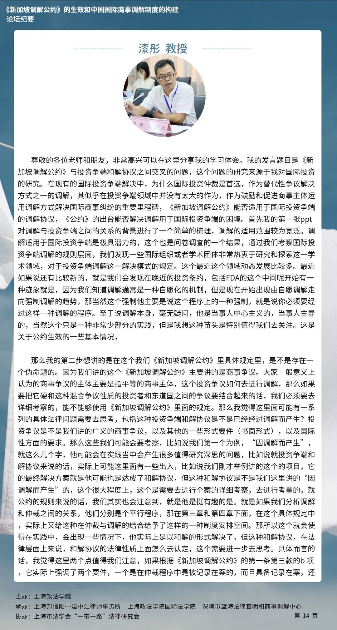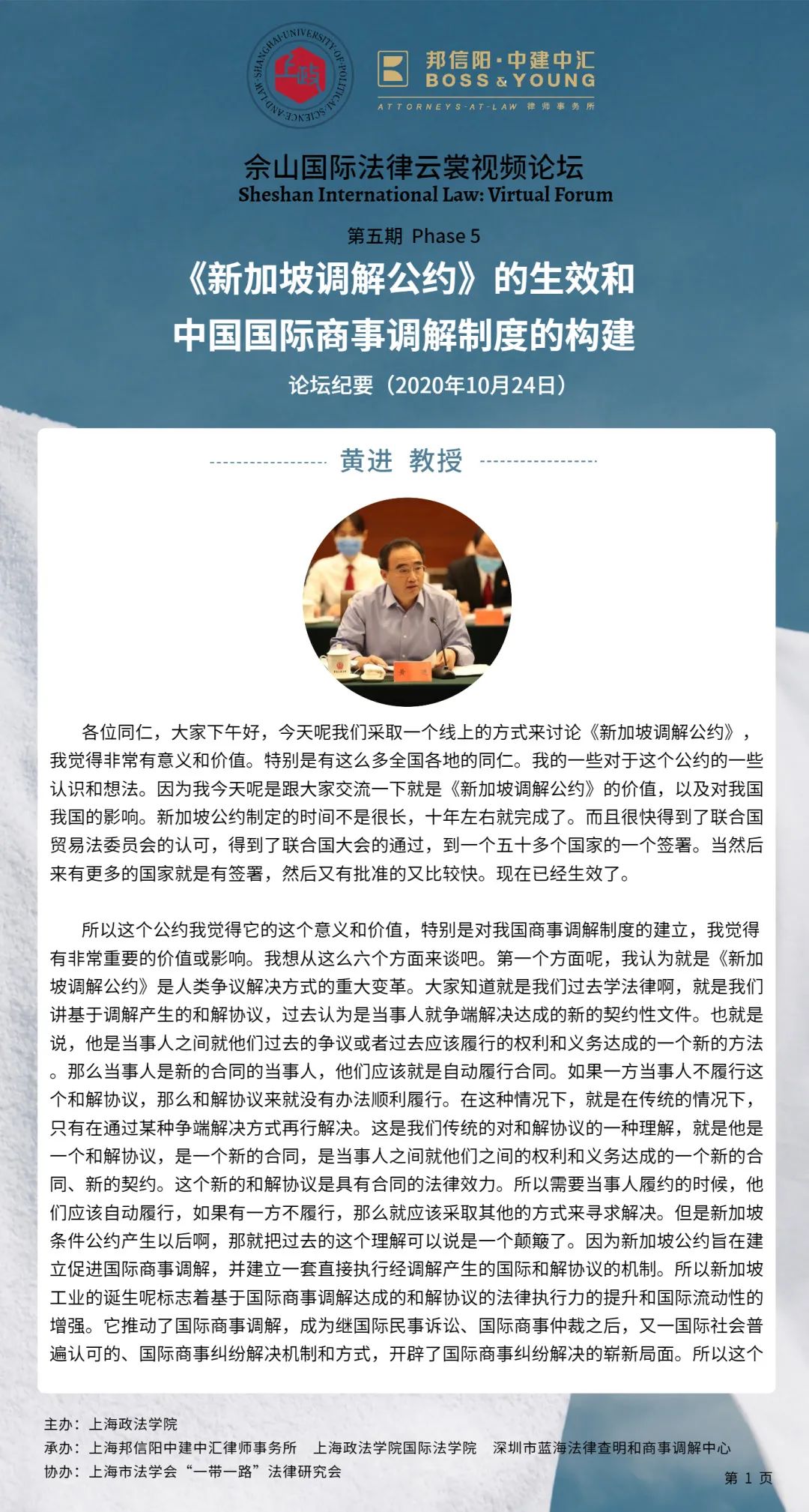 近日,上海政法学院佘山国际法律云裳视频论坛第五期——“《新加坡调解公约》的生效和中国国际商事调解制度的构建”通过ZOOM在线举办。本次论坛由上海政法学院主办,上海政法学院国际法学院、上海邦信阳中建中汇律师事务所、深圳市蓝海法律查明和商事调解中心承办,上海市法学会“一带一路”法律研究会协办,来自中国政法大学、武汉大学、上海政法学院、深圳市法律查明和商事调解中心等高校和机构的6位专家学者进行了发言,校内外师生近三百人参加了本次论坛。