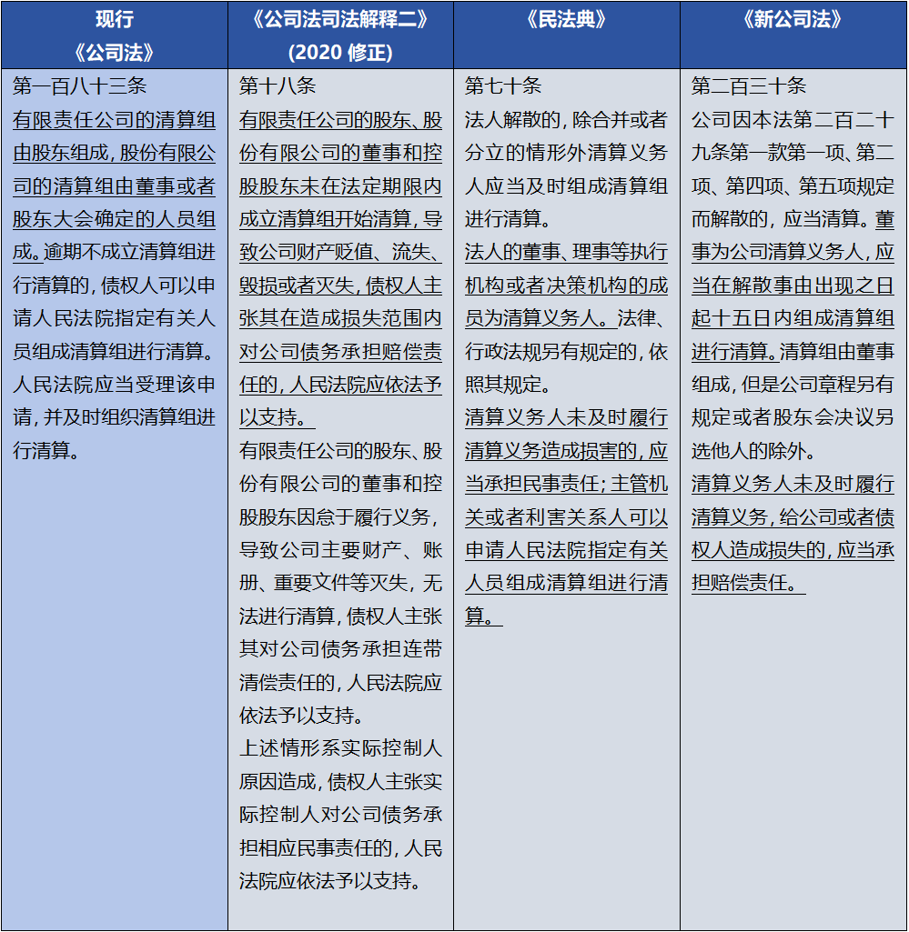 2024年7月1日正式生效的《中华人民共和国公司法》(以下简称《新公司法》)对公司解散清算部分的条款进行了相应的调整,本期话题将围绕 “清算义务人主体的确认及其责任范围”展开。