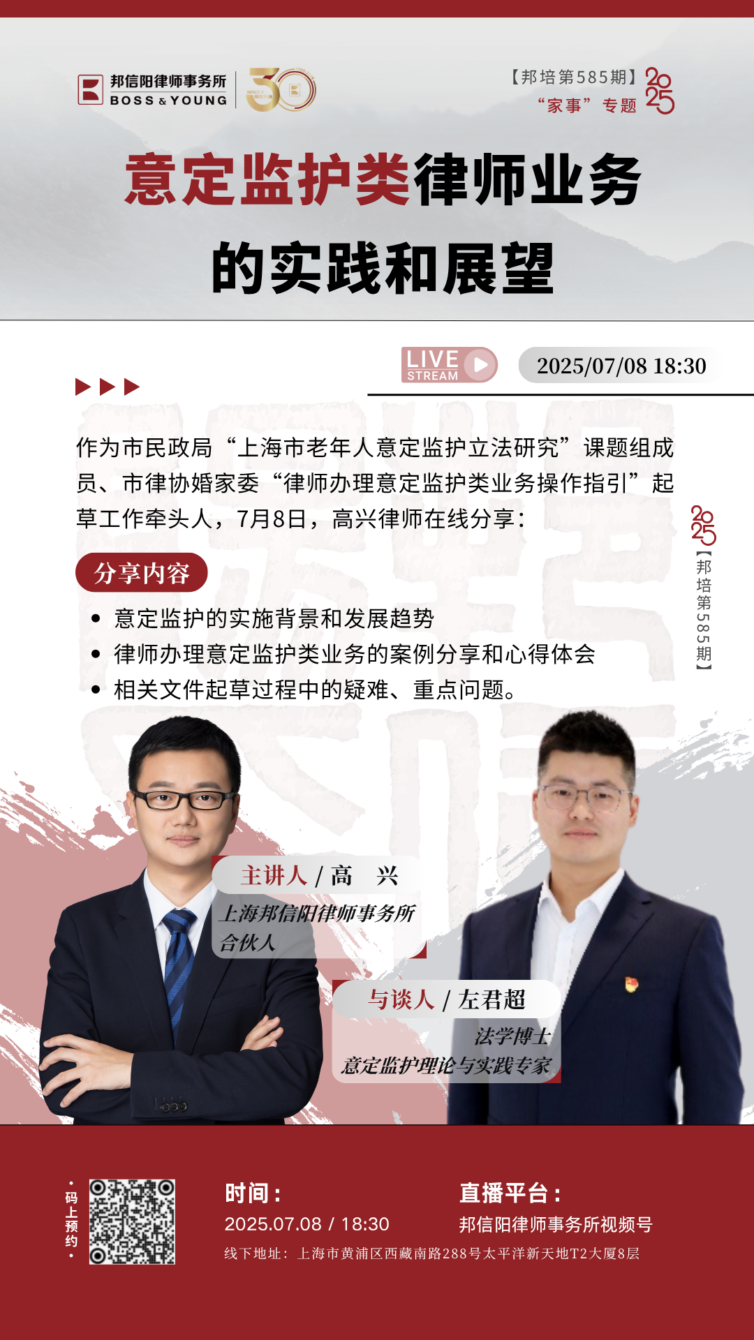 【邦培第585期:意定监护类律师业务的实践和展望】7月8日晚18:30在邦信阳律师事务所视频号直播,欢迎扫码预约。