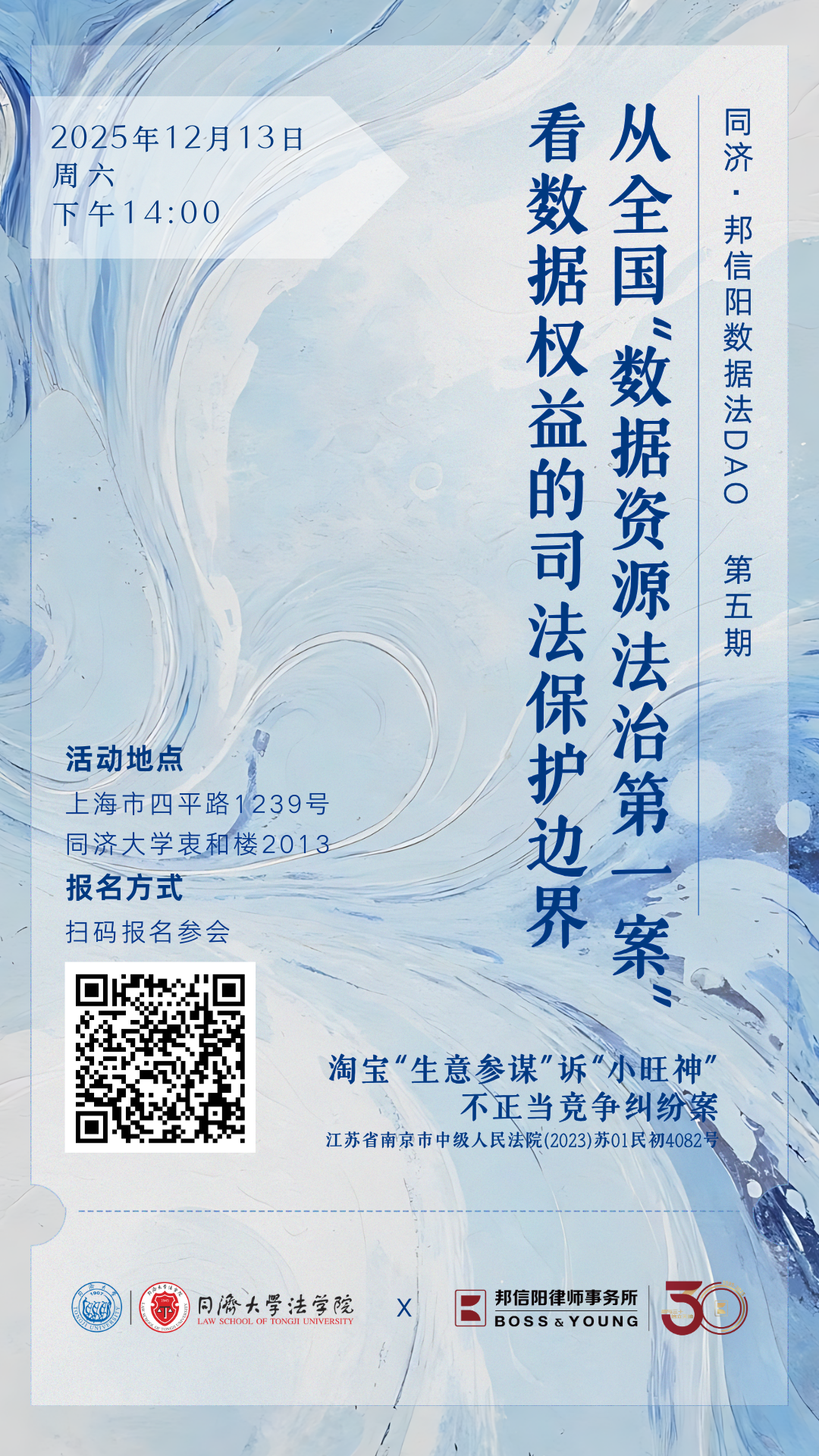 由同济大学法学院联合邦信阳律师事务所共同打造的“同济·邦信阳数据法DAO”第五期活动,将于2025年12月13日下午14:00在同济大学法学院举办。