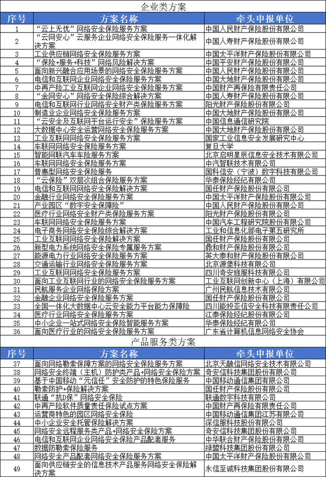2024年4月,工业和信息化部公示了《网络安全保险典型服务方案目录》,在业内引起了广泛的关注,同时也一定程度上反映出了网络安全保险当下的发展趋势,本次共有49个方案入选,企业类方案36个、产品服务类方案13个。其中涉及到了13家保险公司、33家科技公司、2家研究院、以及1所大学。同时方案内容覆盖了金融、医疗、能源、互联网、电信、物联网等多个重点行业和新兴领域。