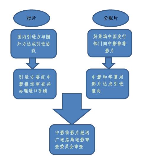 另外,现行立法规定了国外电影进驻我国市场的两种途径和方式:分账片和批片。分账片,即电影版权所有者不卖断发行权,而是委托中介机构代理发行,并事先商定比例,按影片的票房收入分成,以使制片方、发行机构和放映单位利益共享,风险共担。批片,又称买断片,即以固定价格从外国制片商买断放映权,外国制片商不参与中国票房分成。