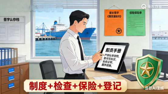 立规矩:在《船员手册》《船舶安全管理体系(SMS)》等文件中明确写入:“严禁船员私自携带犬猫等动物上船。确因船舶防鼠等工作需要携带的,须经公司书面批准,且必须免疫、圈养、登记。”制度需经船员签字确认并存档。