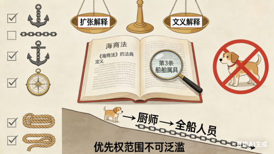 《海商法》第3条定义船舶“包括船舶属具”。但宠物是生物,不能等同于锚链、罗盘等属具。若随意扩张,可能导致优先权范围泛滥,甚至将“船上厨师做饭烫伤船员”也纳入,损害立法严肃性。