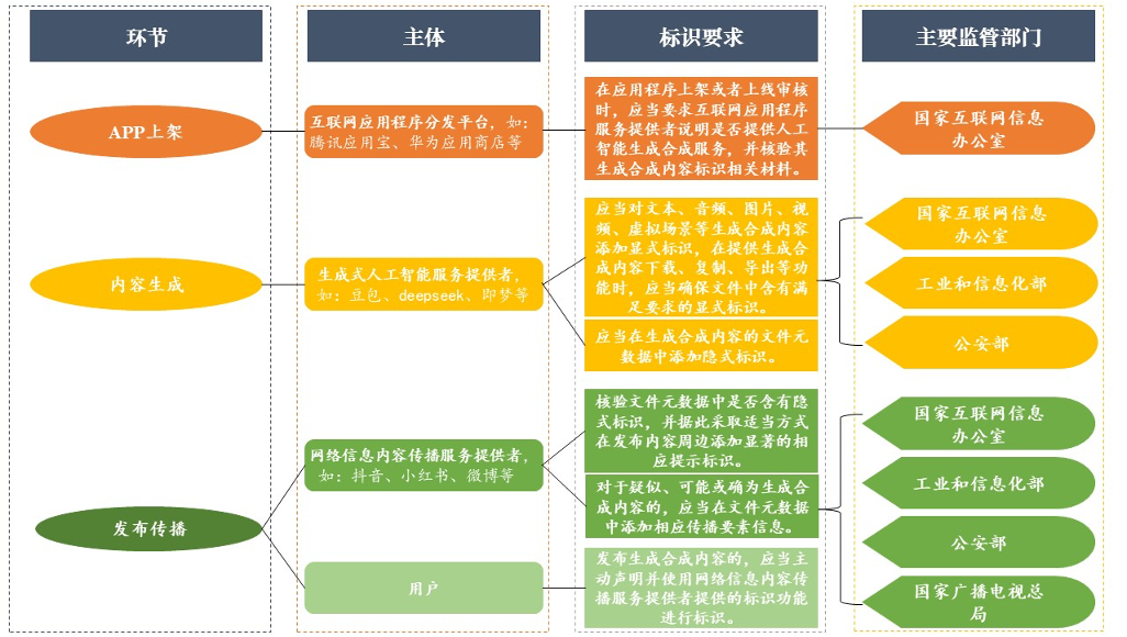 根据《办法》的有关规定,生成合成内容标识监管所涉及的关键环节、每个环节对应的主体与标识要求,以及对应的监管部门基本如下: