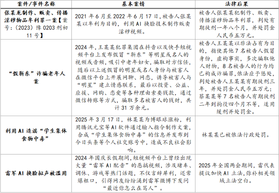 我们看到,即便已有前述法规,利用AI深度伪造、合成虚假信息的案件仍然频发,且从具有个体性的诈骗、涉黄,逐步上升至具有全社会影响力的事件,包括利用AI换脸拟声伪造社会名人发言,甚至是利用AI深度合成能力编造虚假社会事件,且相较于利用AI诈骗、涉黄,后者的行为显然具有更强的破坏力。不完全列举如下: