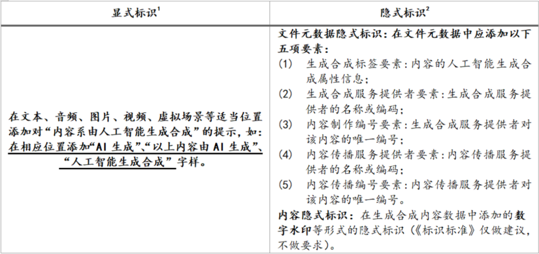 [1]《GB 45438-2025 网络安全技术 人工智能生成合成内容标识方法》附录A、附录C。