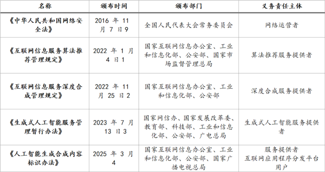但针对这一目标,此前颁布的《中华人民共和国网络安全法》(“《网络安全法》”、《互联网信息服务算法推荐管理规定》(“《算法推荐规定》”)、《互联网信息服务深度合成管理规定》(“《深度合成规定》”)、《生成式人工智能服务管理暂行办法》(“《AIGC暂行办法》”)等法律、行政法规和部门规章已作出类似规定。