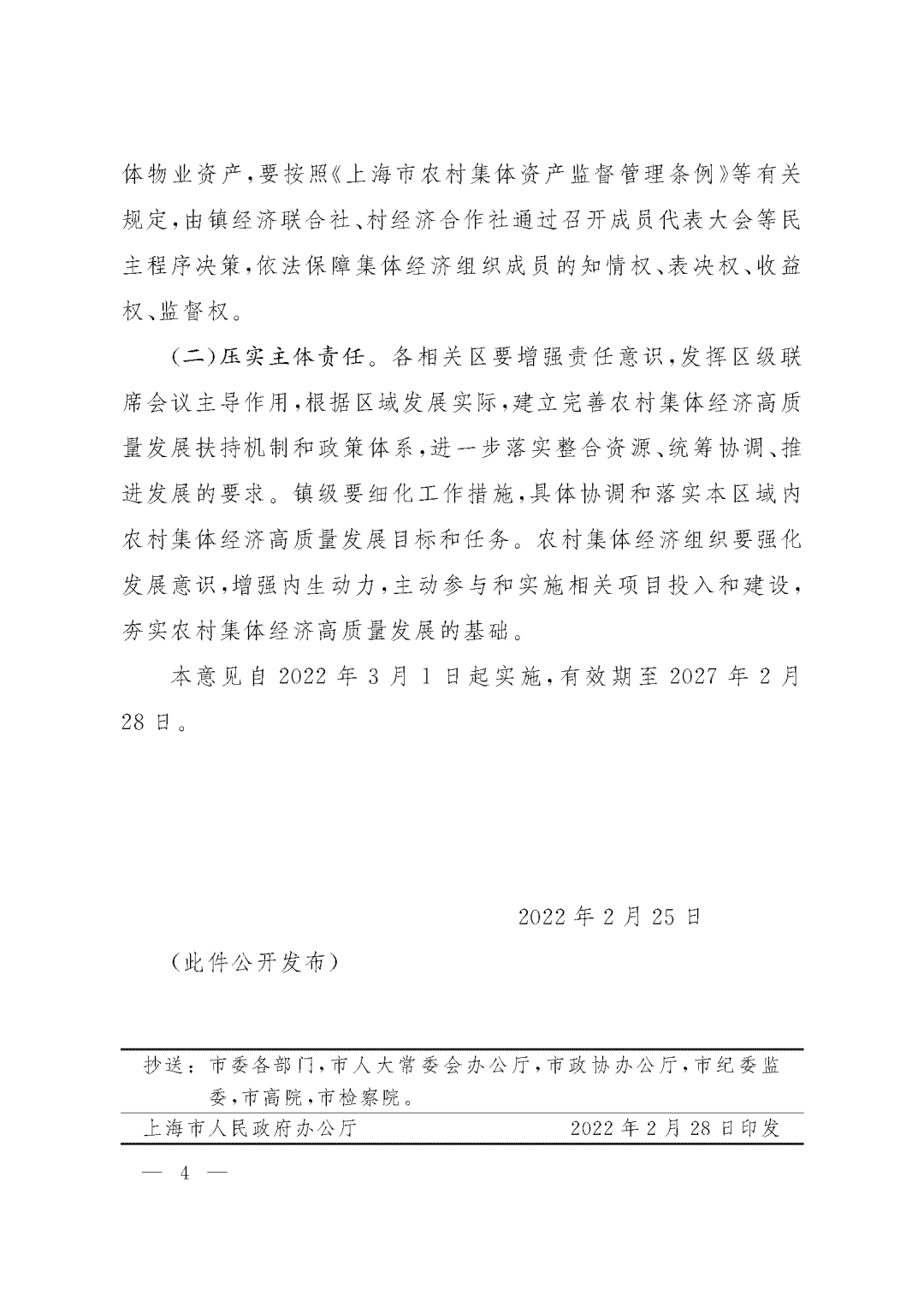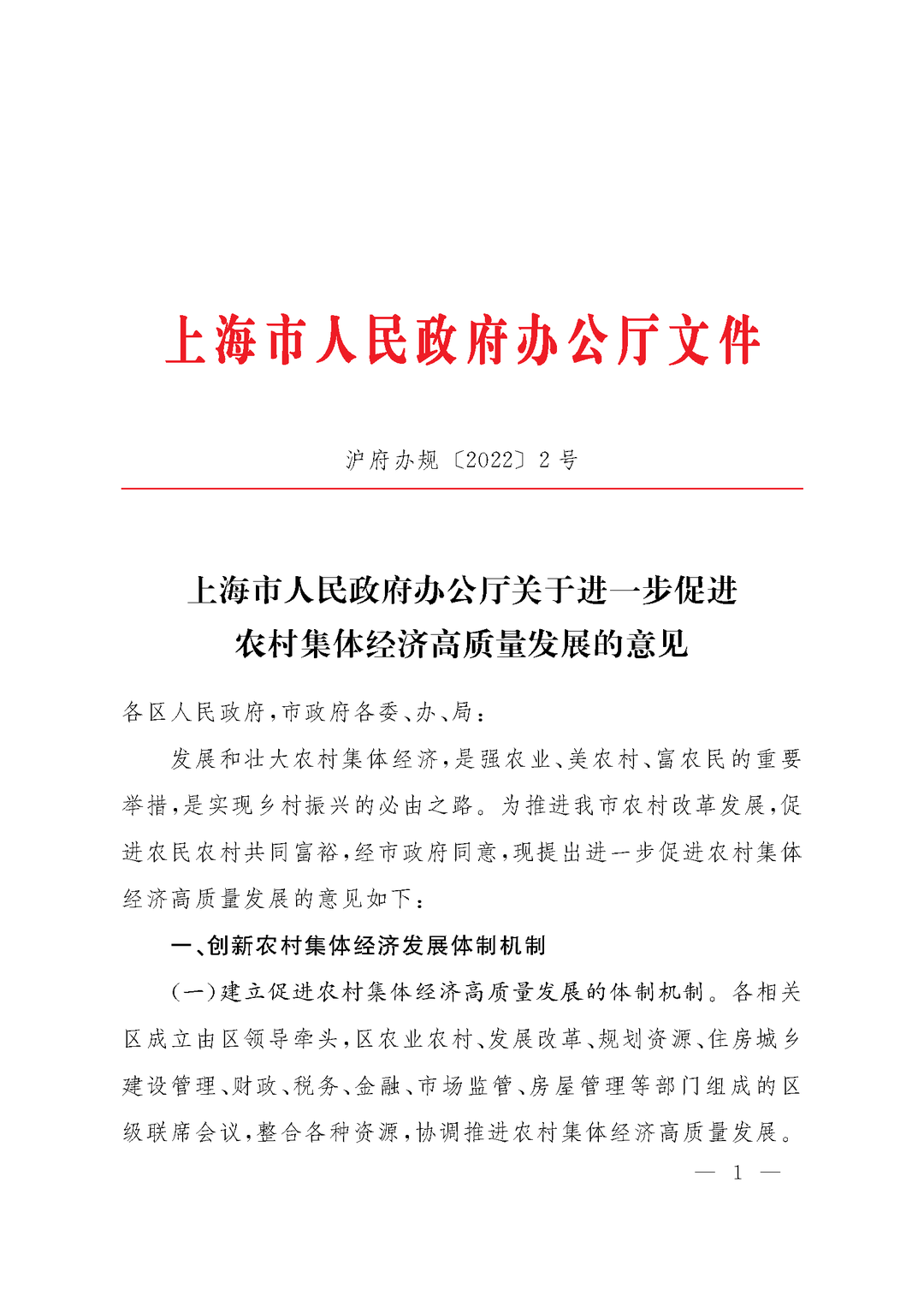 乡村振兴国家战略实施以来,上海发布了一系列的地方法规和政策,包括《上海市农村集体资产监督管理条例》、《上海市乡村振兴战略规划(2018-2022年)》、《上海市乡村振兴战略实施方案(2018-2022年)》等,郊区各镇村也都在不断探索符合当地实际情况的集体经济发展模式。在第一个乡村振兴五年规划收官之际,上海市人民政府办公厅发布了《关于进一步促进农村集体经济高质量发展的意见》(沪府办规〔2022〕2号,下称《意见》),以“高质量发展”为基调,从创新农村集体经济发展体制机制、盘活农村集体存量资金资产、深化农村集体产权制度改革、加大政策扶持力度、强化保障措施等方面提出促进农村集体经济发展的政策措施。《意见》全文如下: