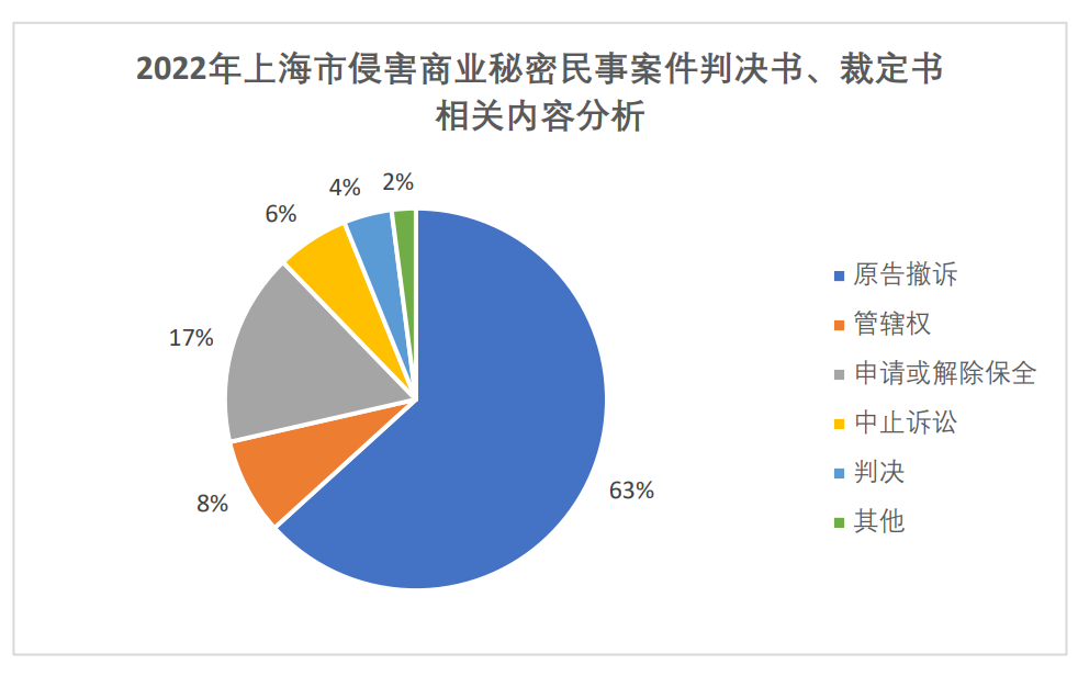 胜诉率方面,我国侵害商业秘密保护案件的胜诉比例相对偏低。以上海市为例,2022年,全市涉侵害商业秘密的民事案件判决书、裁定书共计50份,其中有31份涉及原告撤诉,约占总数的2/3。全国范围内,2022年,共173份案件侵害商业秘密民事案件判决书、裁定书,其中只有27份判决书就侵害商业秘密纠纷做出了实体判决。在这些实体判决中,仅有7例案件胜诉。