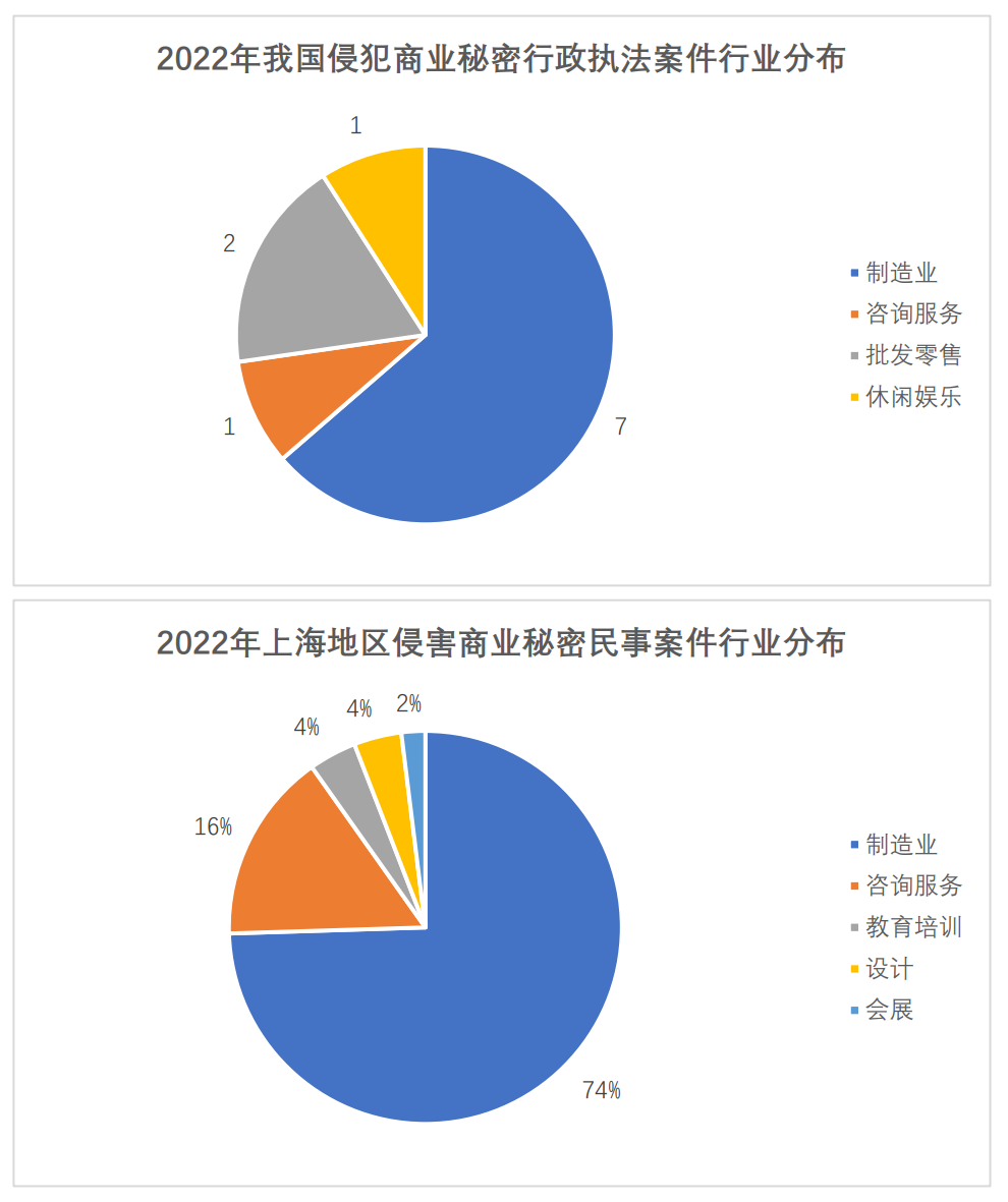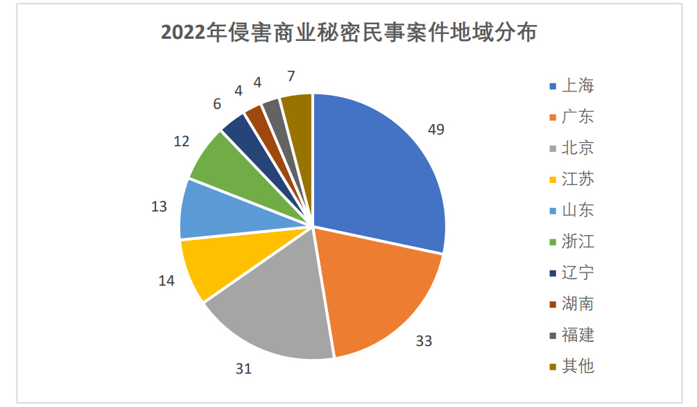 行业分布方面,侵害商业秘密多发于制造业。行政的处罚方面,2022年,有7例案件发生于制造业(含计算机、通信和其他电子设备制造业2例)。司法裁判方面,以上海市为例,2022年侵害商业秘密民事案件中,有74%的案件涉及制造业。我们认为,此类现象的出现,与制造业的行业特点有关:其一,与其他行业相比,制造业涉及更多的技术信息类商业秘密,保密责任相对更重。其二,制造业对技术新颖性要求高,企业更愿意以商业秘密的形式保护。其三,上述技术信息类商业秘密蕴含着大量的商业价值,企业维权动力更大;其四,制造业员工流动量大,相关企业的技术秘密更容易被技术人员跳槽后带走。