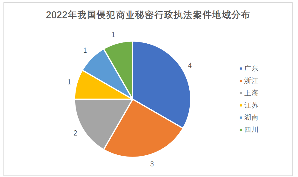 行政处罚方面,通过检索中国市场监管行政处罚文书网、部分地方市场监管局行政处罚公示信息、威科先行、北大法宝数据库,截至发稿之日,检索到近4年商业诋毁行政处罚共计57例,其中2019年18例、2020年11例、2021年16例,2022年12例。在2022年的相关行政处罚中,有10例位于我国东部经济发达地区,其中上海市2例、广东省4例、浙江省3例、江苏省1例。司法裁判方面,2019年~2022年,我国侵害商业秘密民事案件共计1833例,其中2019年655例、2020年660例、2021年345例、2022年173例。这173例侵害商业秘密民事案件中,有143例位于我国东部经济发达地区,其中北京31例(含最高人民法院6例)、上海49例、广东33例、江苏省14例、浙江省12例、福建省4例。