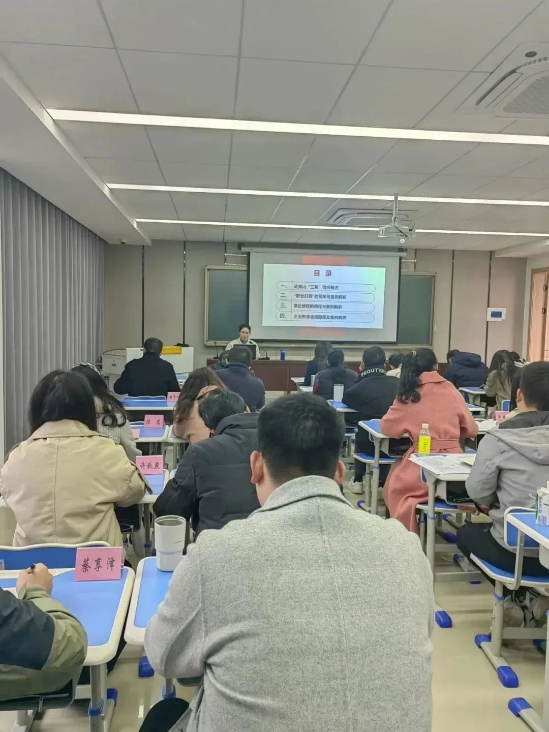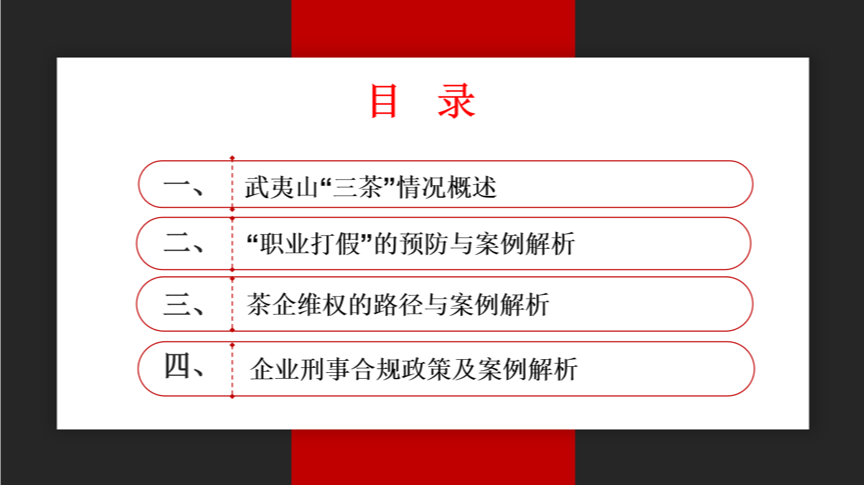 授课由武夷山“三茶”概况、“职业打假”的预防、茶企维权路径以及企业刑事合规政策四个部分组成。