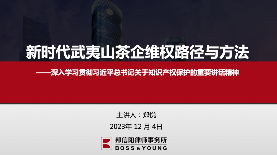 2023年12月4日,邦信阳厦门办公室郑悦律师受中共武夷山市委党校(行政学校)邀请为2023年度第34期青年干部研修班开展《新时代武夷山茶企维权路径与方法》授课。