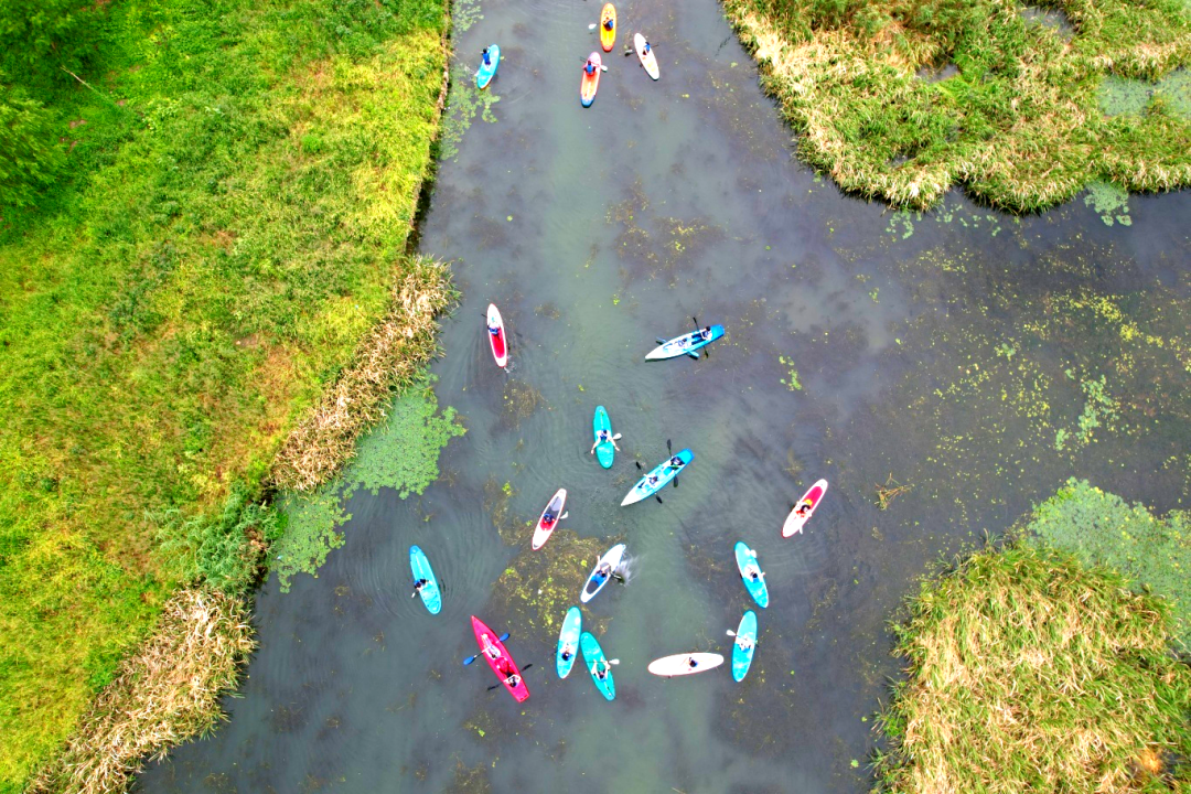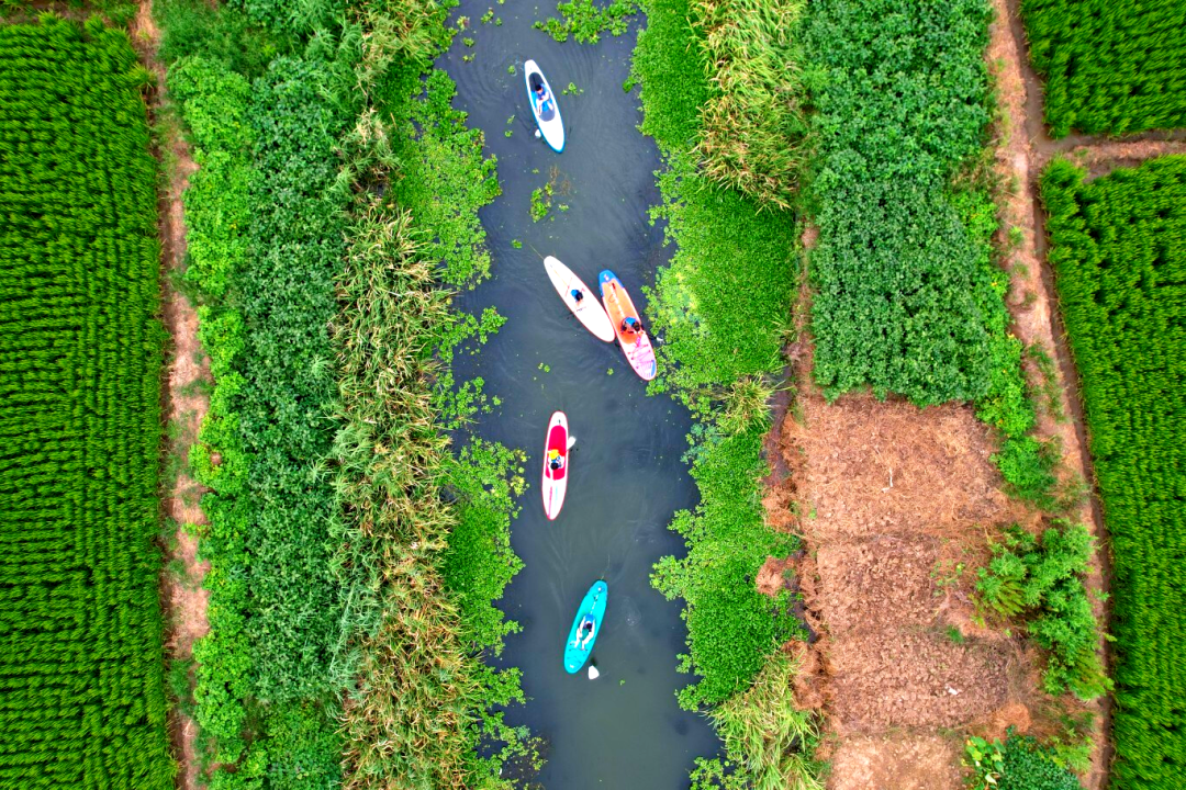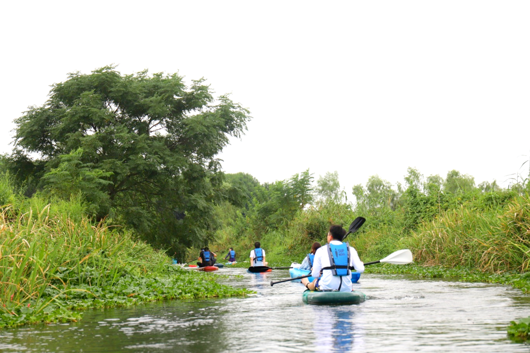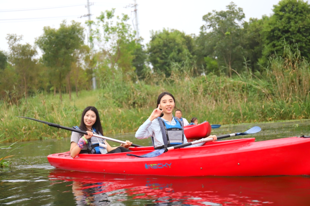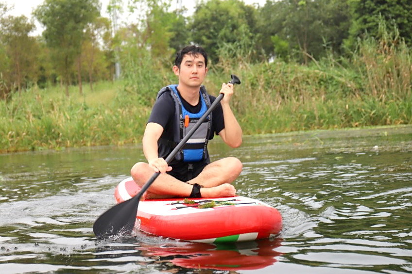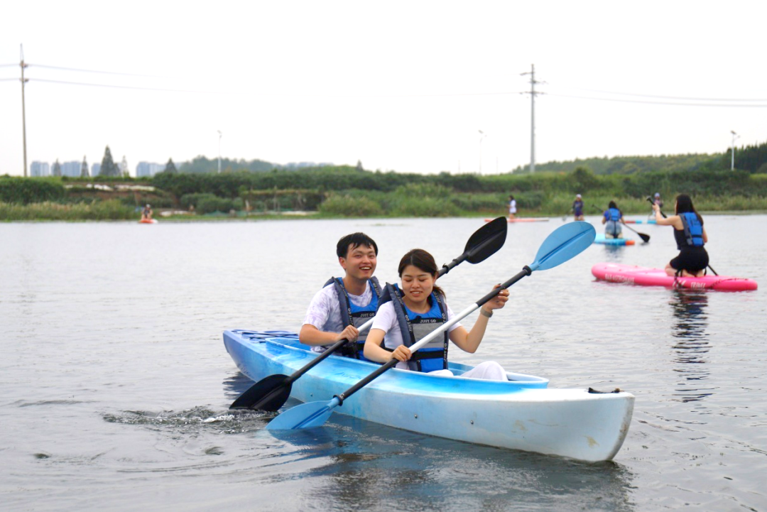 尽管多数成员初步接触桨板,但在有经验同事的带动和教练的协助下,大家迅速解锁了“坐姿”、“卧姿”和“站姿”等进阶姿势,熟练地驾驭着桨板,从容穿梭于湖光水色之间。沿途河道蜿蜒曲折,夕阳余晖洒满湖面,晚霞如火,大家在欢声笑语中尽情领略大自然的宁静与美好。