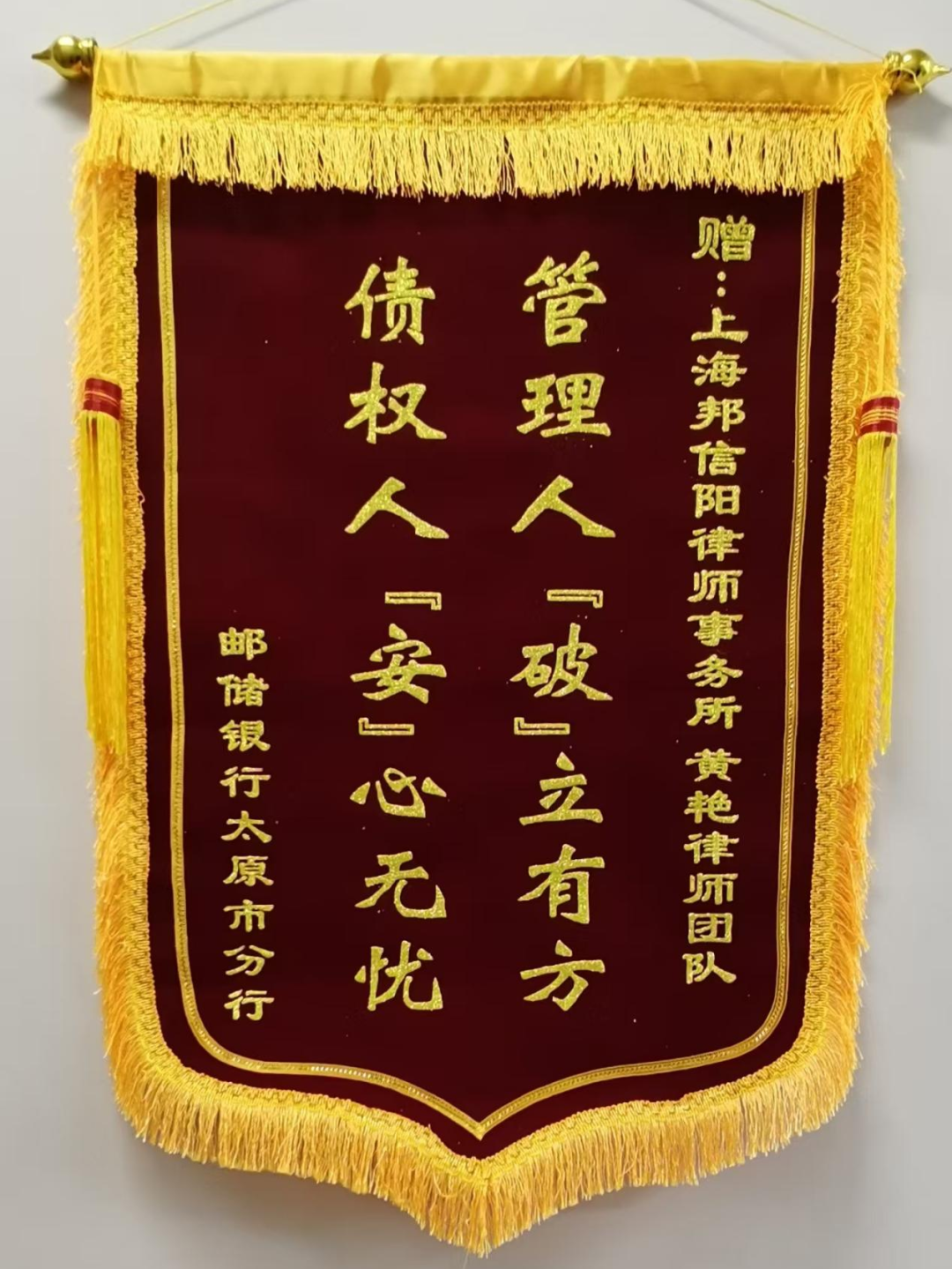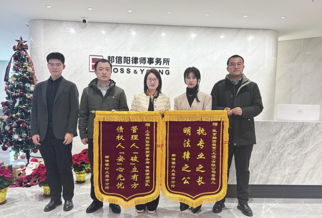 2024年12月18日,中国邮政储蓄银行股份有限公司太原市分行专程自山西到访邦信阳律师事务所上海办公室,对邦信阳作为破产管理人的高质效履职及工作成果表示感谢,并赠送锦旗两面,分别题有“执专业之长,明法律之公”“管理人‘破’立有方,债权人‘安’心无忧”,表达对管理人团队专业能力与履职水平的高度认可。