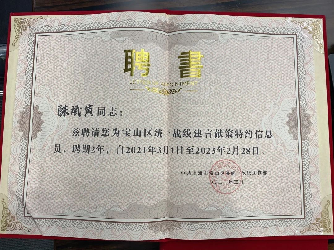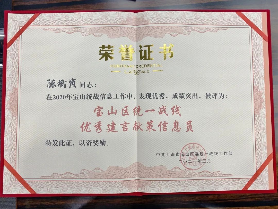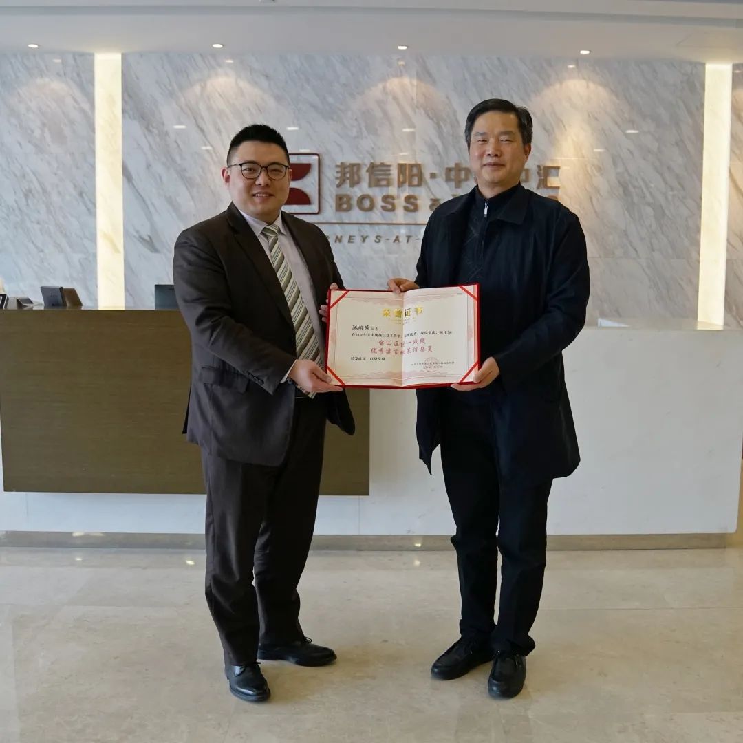 陈斌寅律师荣获2020年宝山区统一战线优秀建言献策特约信息员,并受聘为2021-2023年宝山区统一战线建言献策特约信息员。刘发林部长为邦信阳中建中汇送上新春祝福。