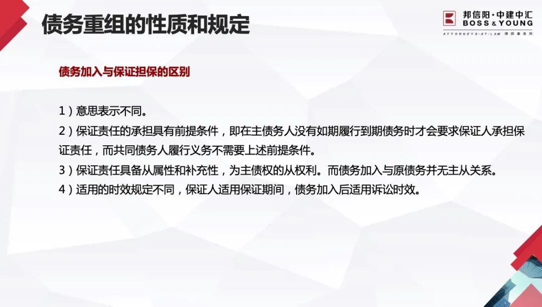 第四部分“债务重组的性质和规定”,主要讲述了民法典中与债务重组相关的法律条文、债主客体变化的内涵与外延、债务加入与保证担保的区别以及第三人代为清偿法律问题。