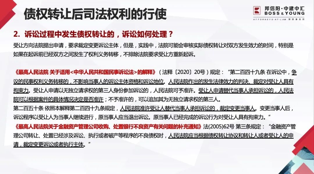 第三部分“债权转让后司法权利的行使”,详细讲述了在不同程序中如何应对债权转让问题,如在诉讼过程中发生债权转让时的诉讼应对策略;破产过程中,债权登记前,债权转让的申请人问题等等。