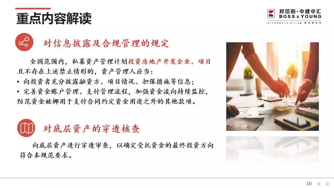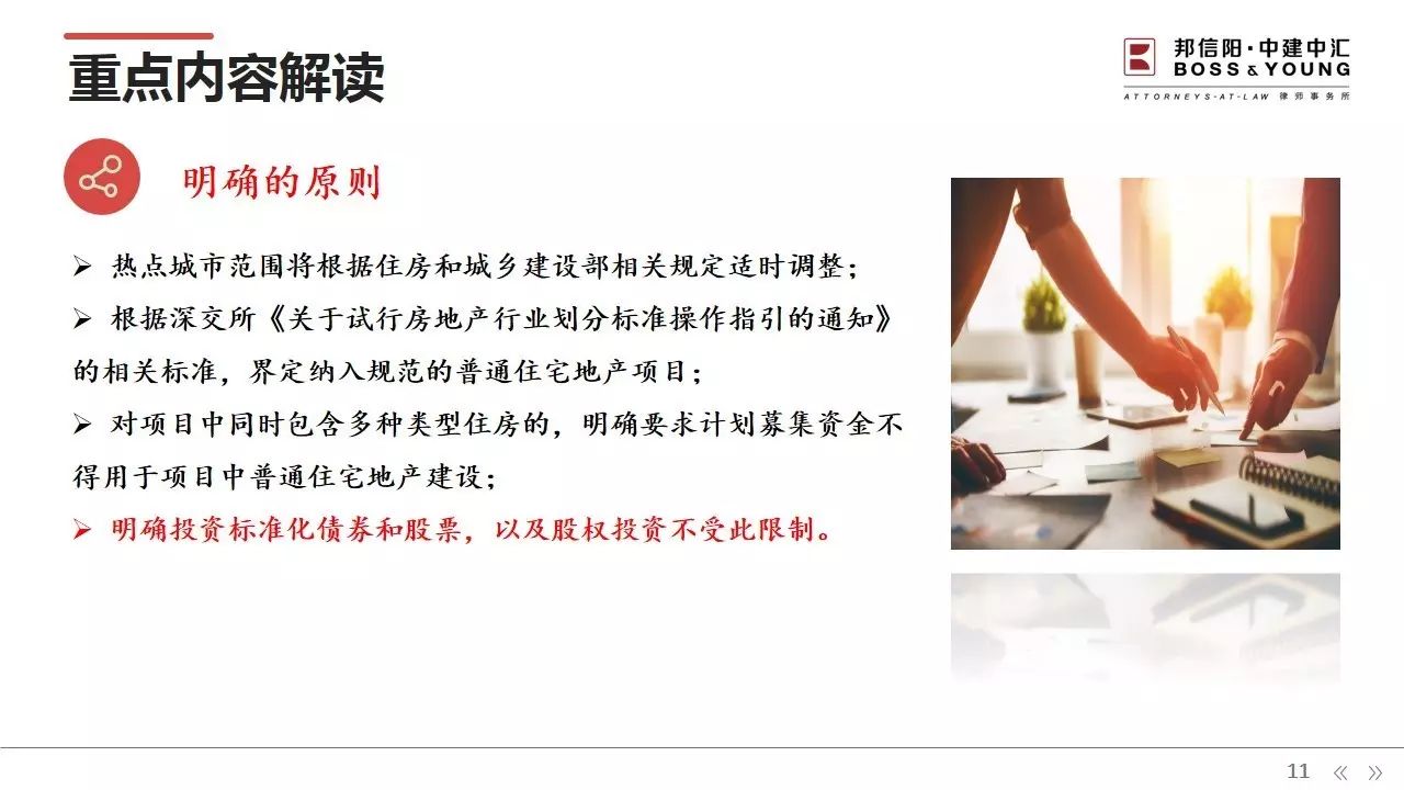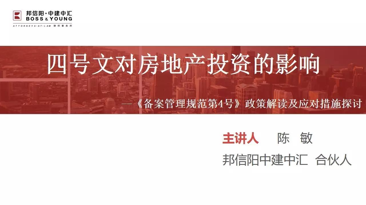 在这样的大背景下,上海邦信阳中建中汇律师事务所合伙人陈敏律师针对这一政策,在所内开展一次业务交流,内容主要涉及该发文出台前国家政策对房地产企业融资渠道紧收的过程、发文的重点内容解读,以及对私募基金投资房地产项目的影响,并探讨相关的应对措施,为目前的投资机构指出了新的业务开展方向。