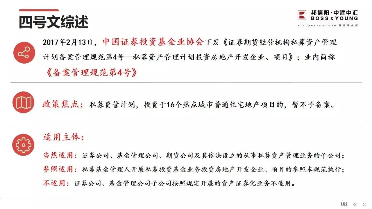 2017年2月13日,基金业协会发布了《证券期货经营机构私募资产管理计划备案管理规范第4号》(简称:《备案管理规范第4号》),对房地产领域投资进行了限制。虽然相关部门早已发布一系列限制政策,但《备案管理规范第4号》明确规定私募投资基金须参照适用,这无疑给大多数活跃在房地产投资领域的私募基金当头一棒。