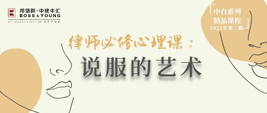 2021年5月24日(周一)18:30,邦信阳中建中汇中台精品课程第三期邀请知名心理学专家钱颖导师,主讲“律师必修心理学:说服的艺术”。