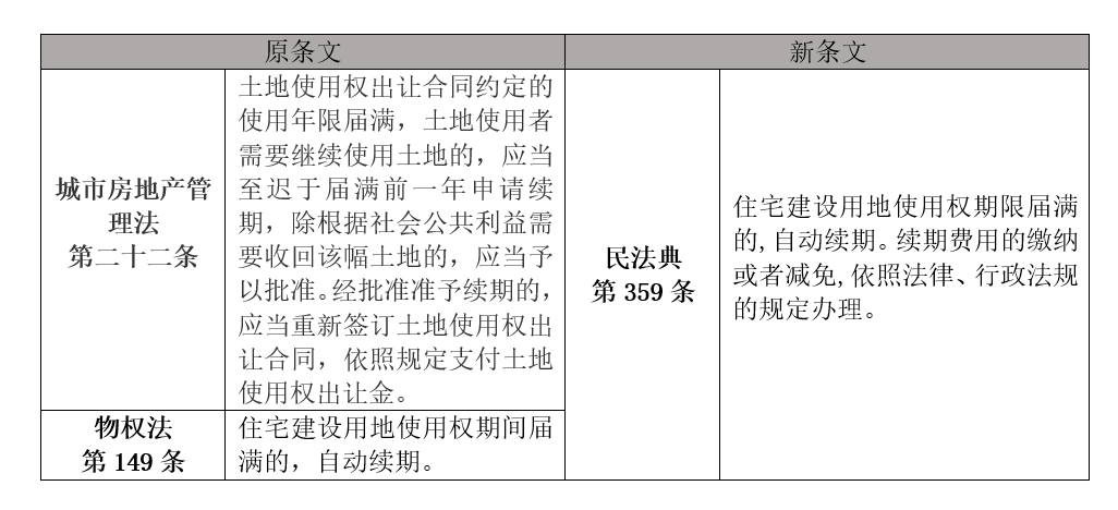 1995年,中华人民共和国城市房地产管理法生效,该法第21条(2009年修正后为第22条)没有区分不同类型的建设用地使用权,一律规定为到期前需提出续期申请并再支付土地使用权出让金。2007年生效的物权法修改了这一规定,对于住宅建设用地使用权规定为到期自动续期。但是,对于续期后是否需要缴纳土地出让金、缴纳标准和支付方式如何等问题,物权法进行了回避,留待今后立法予以明确。由于1990年颁布的城镇国有土地使用权出让和转让暂行条例第12条已经将居住用地使用权的最高年限规定为70年,故住宅用地使用权期限届满后如何处理的问题尚不十分急迫。