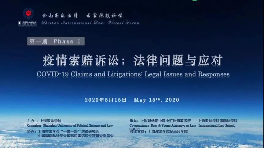 5月15日,由上海政法学院主办,上海邦信阳中建中汇律师事务所与上海政法学院国际法学院联合承办的“佘山国际法律-云裳视频论坛”第一期——“疫情索赔诉讼:法律问题及应对”通过ZOOM平台在线成功举行。此次论坛邀请到了来自武汉大学、日本同志社大学、英国牛津大学、北京大学、中国政法大学和上海政法学院等国内外高校、科研机构和法律实务部门的6位主讲嘉宾。论坛举办之初就引起了国际法律领域专家学者和政府部门的重视,吸引了来自本校、国内外高校、研究机构和实务部门近500位观众的线上参与。