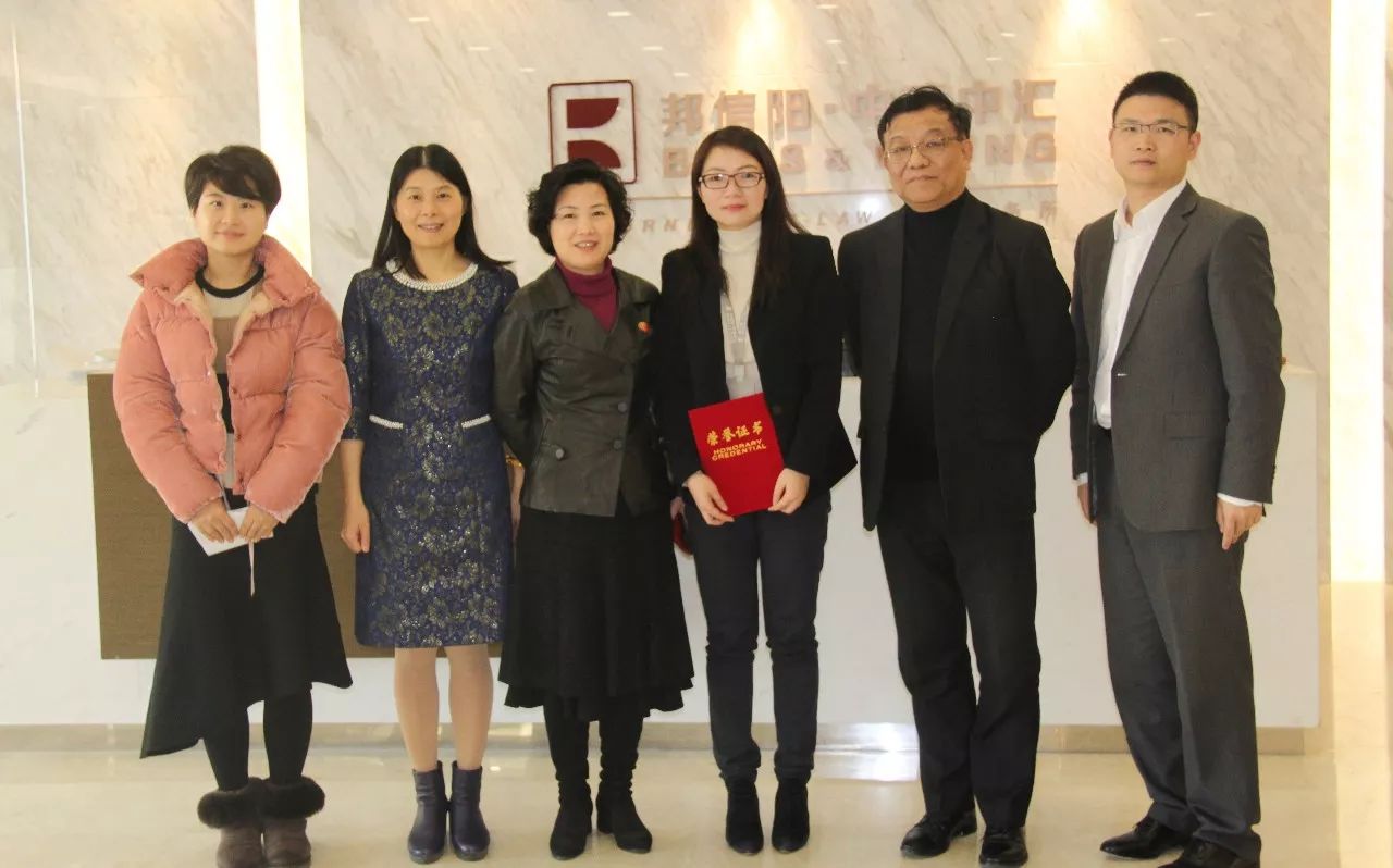 今日下午,小东门街道工作委员会党工委副书记、纪工委书记、总工会主席张红莺等一行到邦信阳中建中汇访问交流。本所合伙人王家德、赵亮波、姚佩芳和姚丽静律师进行了接待。