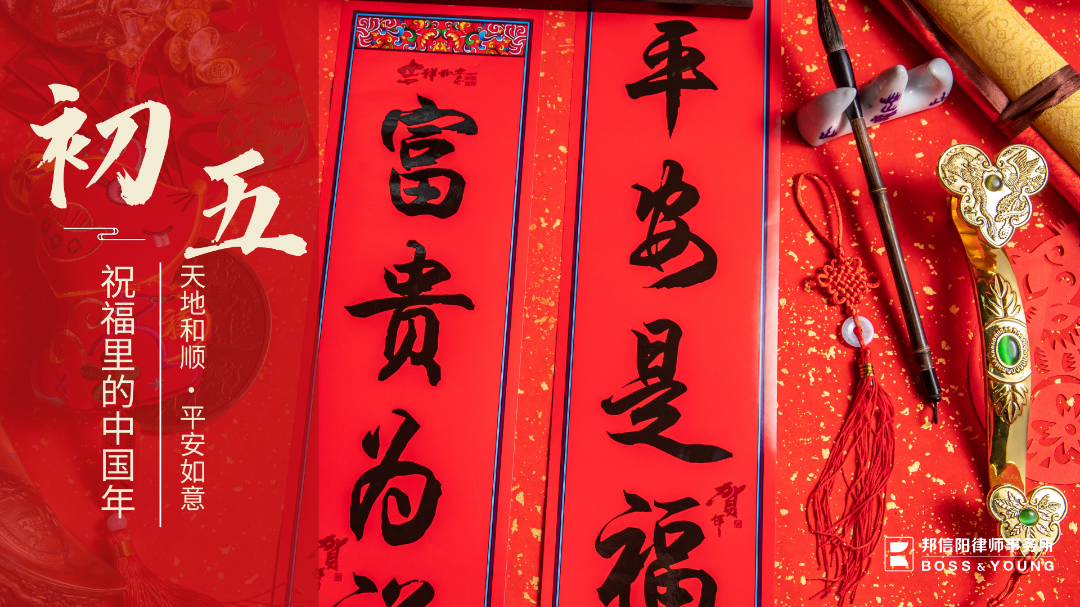 在今天这个特殊的日子里,大年初五,我们不仅欢庆财神爷的降临,更以春联为载体,将满载祝福与期许的文字传递给您。为此,邦信阳律师事务所向您在大年初五的日子里送上春联,希望它带着富贵吉祥的喜庆伴随您这个春节以及新的一年。