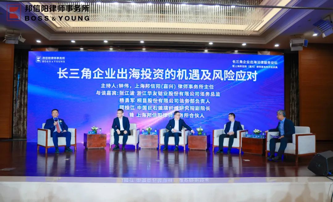 浙江华友钴业股份有限公司法务总监张江波、桐昆股份有限公司法务部负责人杨勇军、中国巨石玻璃纤维研究院副院长顾桂江以及上海邦信阳律师事务所李锋围绕“长三角企业出海投资的机遇及风险应对”这一主题,就企业出海所涉及的法律问题、解决方案及未来发展进行了深入探讨。上海邦信阳(嘉兴)律所事务所主任钟伟担任圆桌论坛主持人。