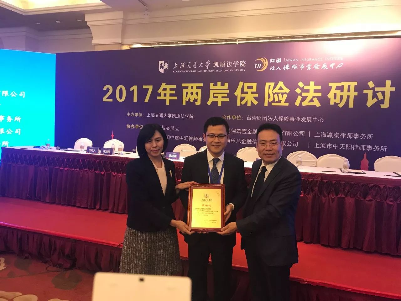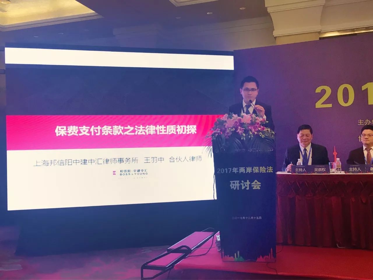 2017年12月15日,由上海交通大学凯原法学院与台湾财团法人保险事业发展中心合作举办、本所与安阳仲裁委员会等六家单位共同协办的2017年两岸保险法研讨会在上海虹桥迎宾馆夏宫厅隆重举行,本所合伙人王羽中律师受邀作为演讲嘉宾参与了此次研讨会。