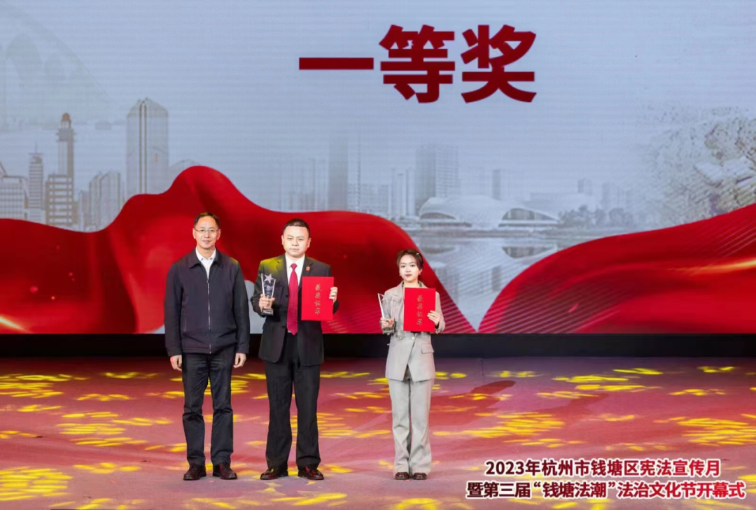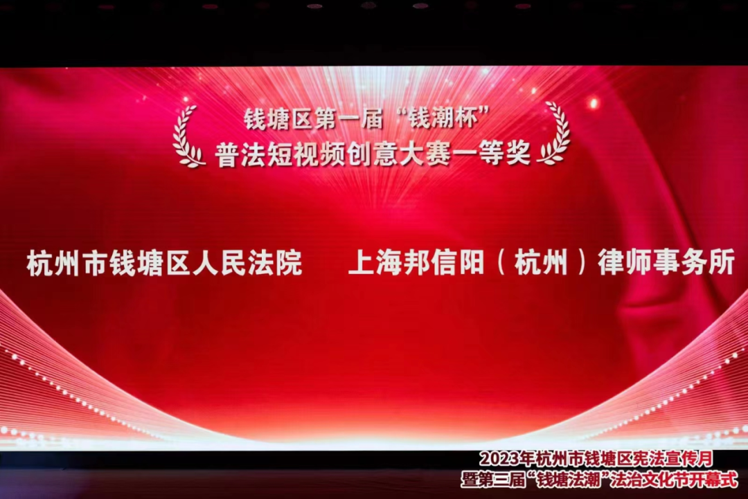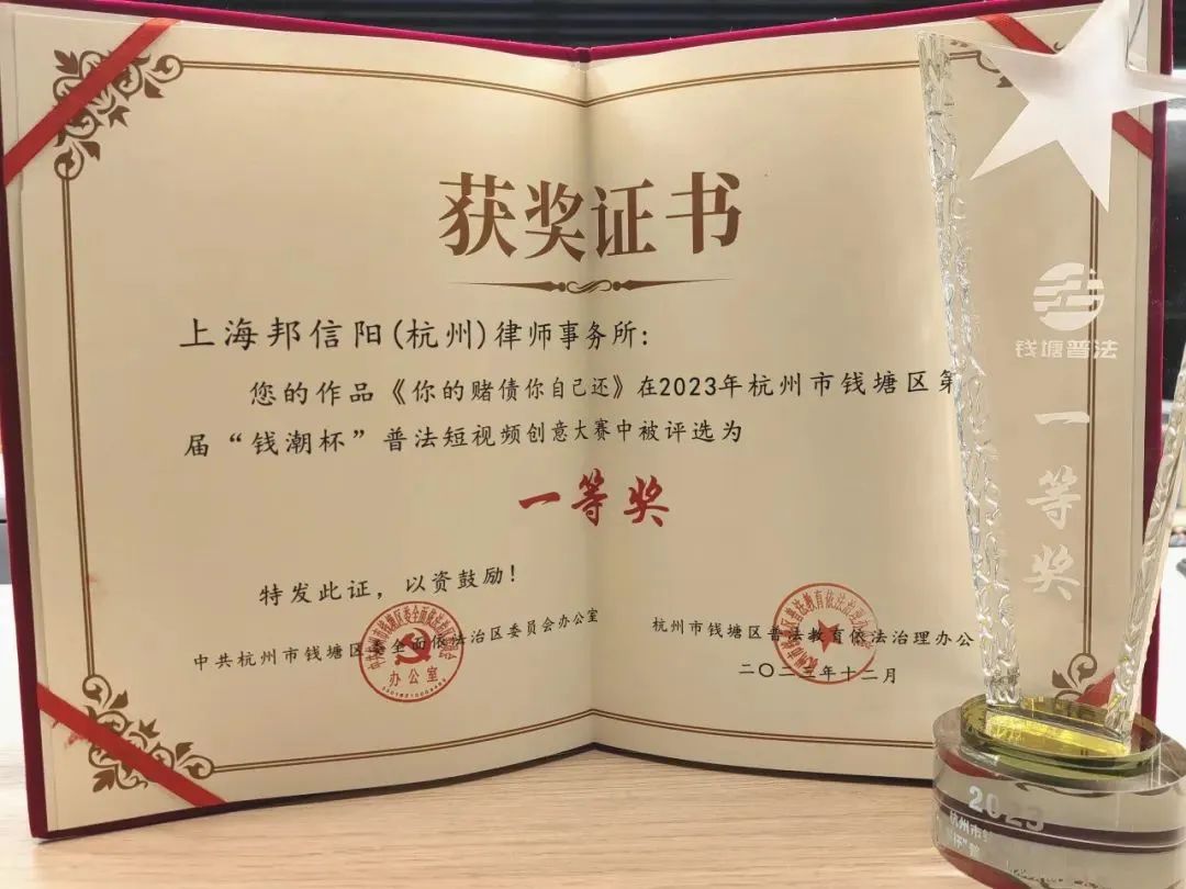 在由钱塘区司法局、钱塘区普法办主办,浙江工商大学宣传部(教师工作部)承办的第一届“钱潮杯”普法短视频创意大赛中,邦信阳杭州办公室律师和律师助理共同创作的作品——《你的赌债你自己还》获得一等奖佳绩。近日,在2023年杭州市钱塘区宪法宣传月暨第三届“钱塘法潮”法治文化节开幕式上举行颁奖仪式。