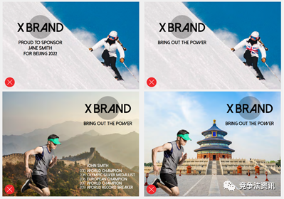 上述范例的违规点分别为:使用“北京2022”文案,使用参赛运动员官方奥运队服,以及使用长城、天坛等中国标志性建筑物。