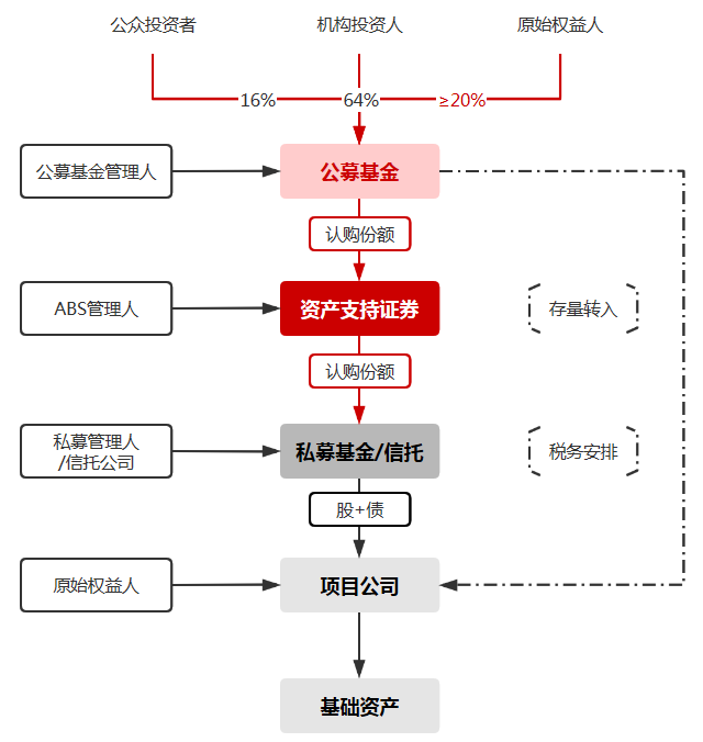 但是,结合现有主流的类REITS结构,如在其上端再搭建一层公募基金,公募REITS的结构将可能达到四层之多(详见下图,且在当前REITS未有特殊税务优惠的前提下,每层结构都有其必要性),而每搭建一层结构,都意味着一层成本的增加以及管理和效率的削弱。