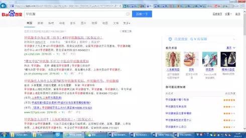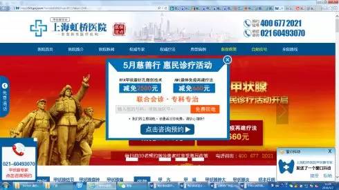 再以百度为例,当网络用户搜索某个疾病名称或症状时,排名靠前的主要是一些提供诊疗服务的医疗机构的介绍,并不是该疾病病理、预防、治疗的科普知识的介绍,一旦点击搜索结果网页链接,除了医疗机构介绍外,一般会出现咨询电话、网上咨询链接等,如下图: