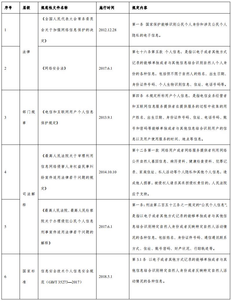属于最高位阶法律且颁布较早的《全国人民代表大会常务委员会关于加强网络信息保护的决定》(序号1,下称“决定”)采取了概括式的定义方式,但并未罗列具体个人信息种类,而之后颁布同位阶法律或者职能部门规章或指导具体行业的国家标准,在沿袭《决定》的部分定义后,还会针对本规定专门调整的对象的不同,相应罗列可能受本规定调整的个人信息种类。