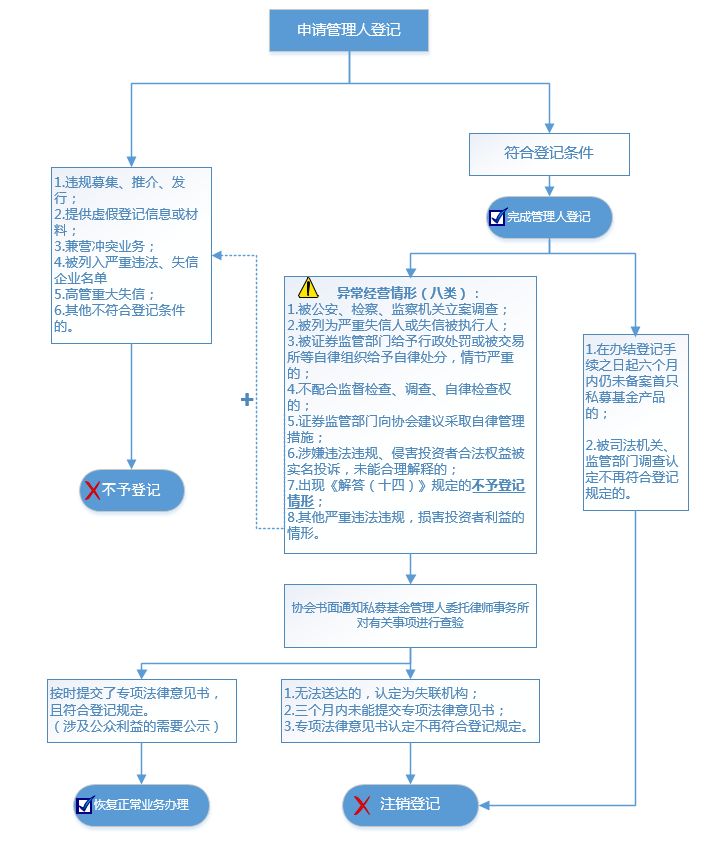 根据本次最新出台的自律管理新政及附件《关于私募基金管理人在异常经营情形下提交专项法律意见书的公告》,结合根据《中华人民共和国证券投资基金法》、《私募投资基金监督管理暂行办法》、《私募投资基金管理人登记和基金备案办法(试行)》、协会在2016年2月5日发布的《关于进一步规范私募基金管理人登记若干事项的公告》及相关自律规则、《私募基金登记备案相关问题解答(十四)》(“问答(十四)”)等规定,我们整理归纳了下表中的8类“异常经营”情形以及6类“不予登记”情况(具体情形描述参见注释),并分别作了说明: