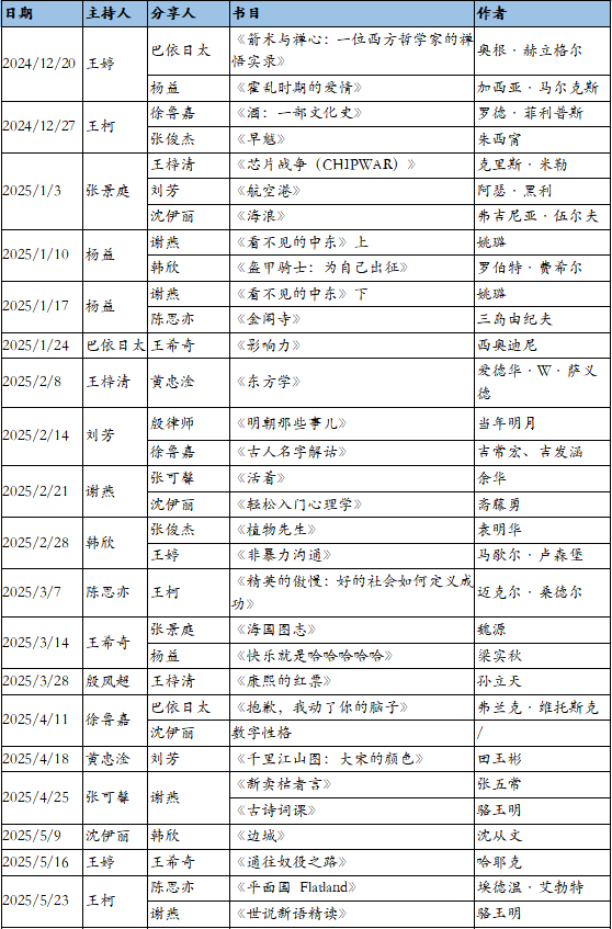 从2024/12/20至2025/7/11(共25周)期间,律所读书会保持一周一会的频率,共分享了42本书籍,具体如下: