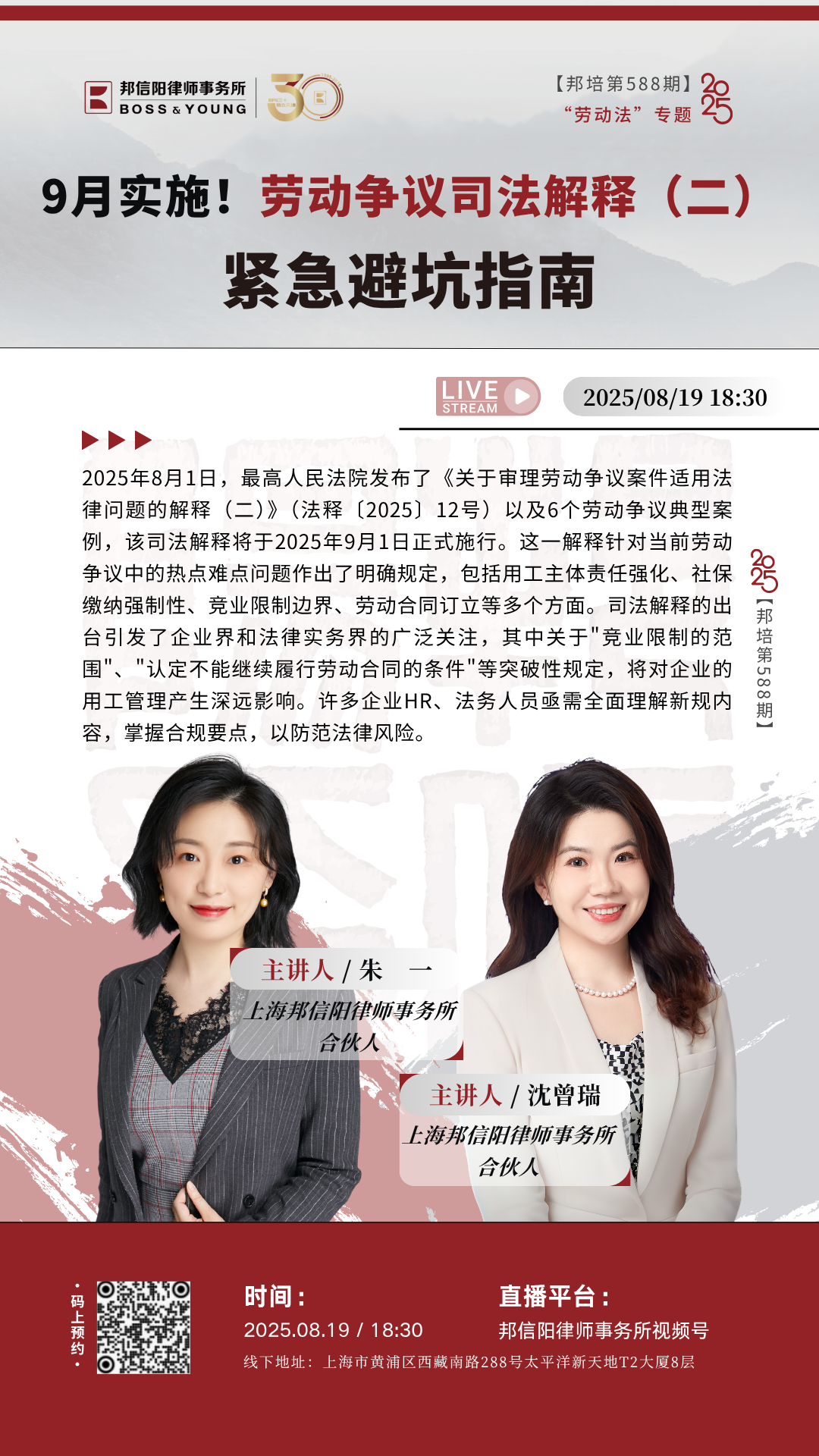 【邦培第588期:9月实施!劳动争议司法解释(二)紧急避坑指南】8月19日晚18:30在邦信阳律师事务所视频号直播,欢迎扫码预约。