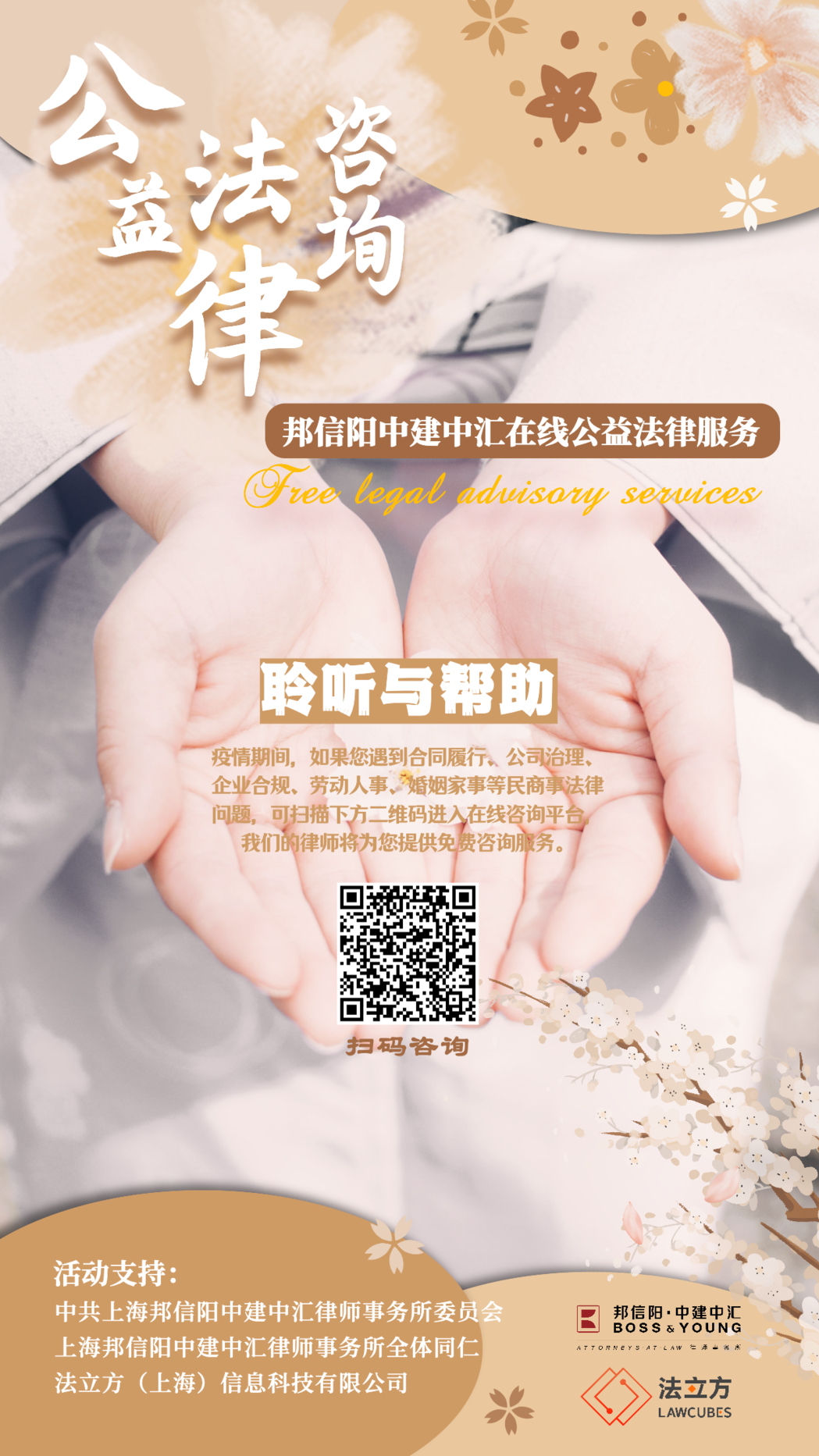 “邦信阳中建中汇在线公益法律咨询”是由上海邦信阳中建中汇律师事务所、法立方(上海)信息科技有限公司联合创设的线上法律咨询平台,平台汇集邦信阳中建中汇数十名专业律师,可为公众解答合同履行、公司治理、企业合规、劳动人事、婚姻家事等民商事法律问题。