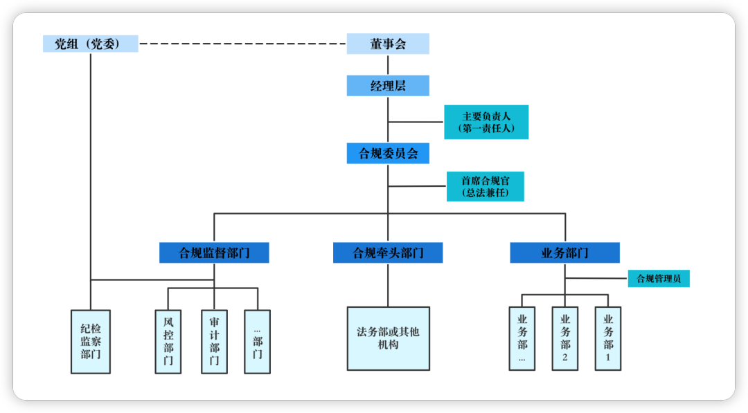 合理搭建组织机构、明确各方责任是确保合规制度能被贯彻落实的必要前提。就目前合规管理实践而言,相关部门的权责不够明晰,发生合规风险事件产生相互推诿的情况一直是国有企业合规管理中的共性问题。为解决这一问题,本次《管理办法》对于如何搭建中央企业组织机构的规定更加全面,不仅提出首席合规官的设置,更是进一步明确央企主要负责人作为第一责任人的权责,并对党委(党组)、董事会和经理层等组织机构在合规管理工作上的职责作出清晰规定。