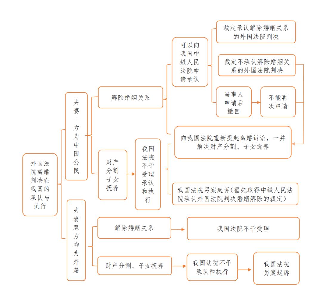如外国法院离婚判决中既有准予离婚的内容,又有关于夫妻财产分割、子女抚养的内容,笔者认为对于外国法院离婚判决应采用二分法分别对待,如下图:
