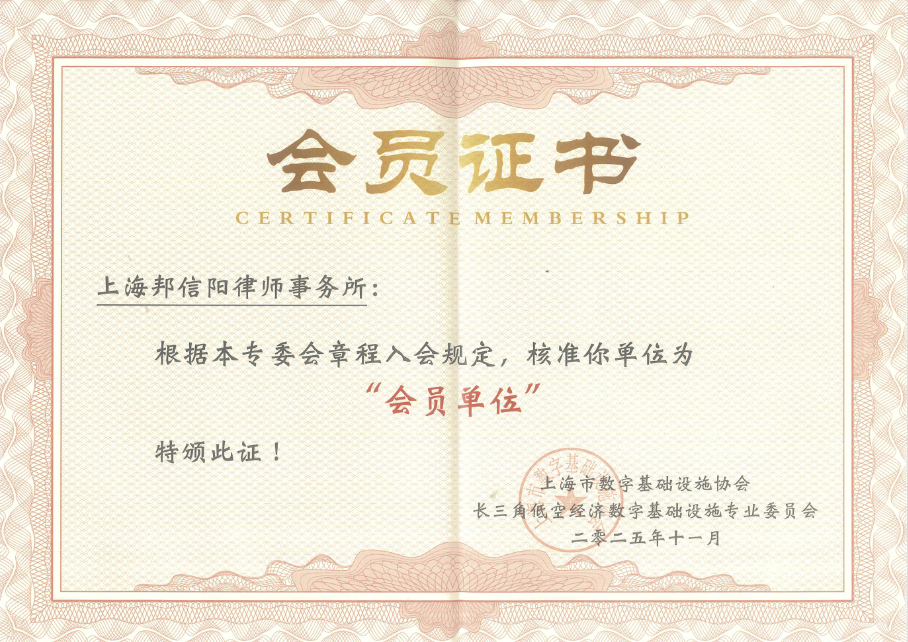 近日,上海邦信阳律师事务所正式获准加入“长三角低空经济数字基础设施专业委员会”,成为该专业委员会的会员单位,并获颁会员证书。