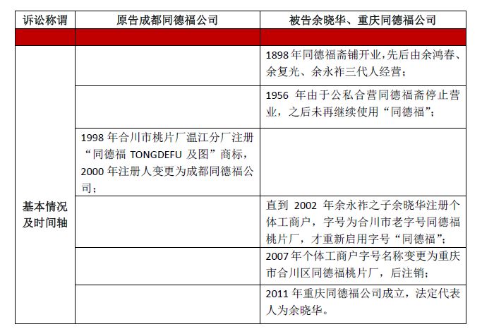 原告成都同德福合川桃片食品有限公司(以下简称“成都同德福公司”)认为被告余晓华成立的个体工商户和重庆市合川区同德福桃片有限公司(以下简称“重庆同德福公司”)在其字号及生产的桃片外包装上突出使用了“同德福”,侵害了原告享有的“同德福TONGDEFU及图”注册商标专用权并构成不正当竞争。