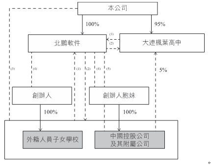 其中本公司指上市的开曼公司,中国控股公司及其附属公司指大连枫叶教育集团有限公司及其关联公司和其创办的一系列国际学校,和外资人员子女学校合称综合连属实体,实线代表直接法定及实益拥有股权,虚线代表合约安排。资金流向数字的含义具体如下: